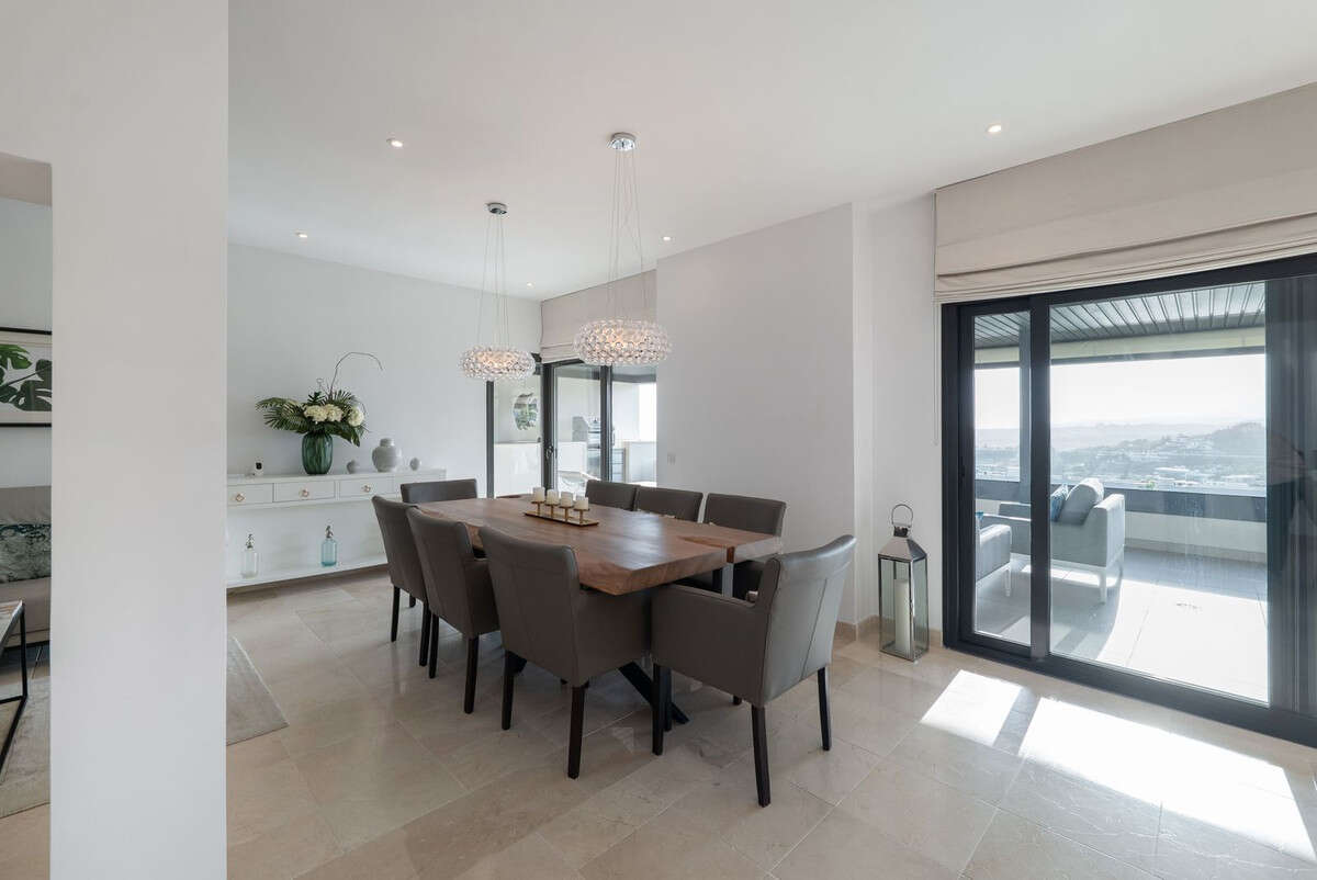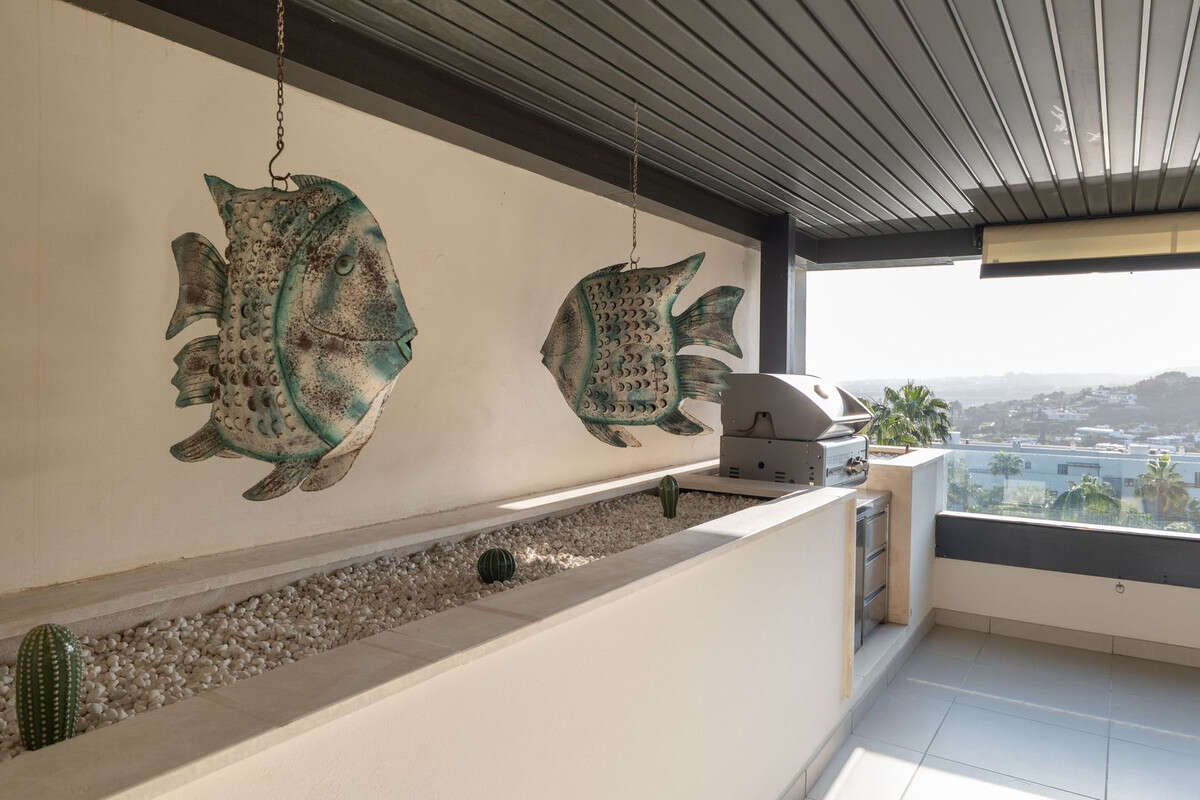 The terrace has also been merged and expanded, offering spectacular panoramic views of the sea, mountains, Gibraltar and the golf course. Its west-facing orientation provides stunning sunsets. The terrace includes a barbecue area and awnings for sun protection.