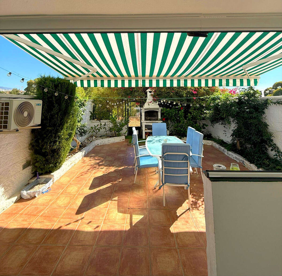 Additional features include air conditioning in the main living area, electric awnings on the terrace, and mosquito screens throughout for added comfort.