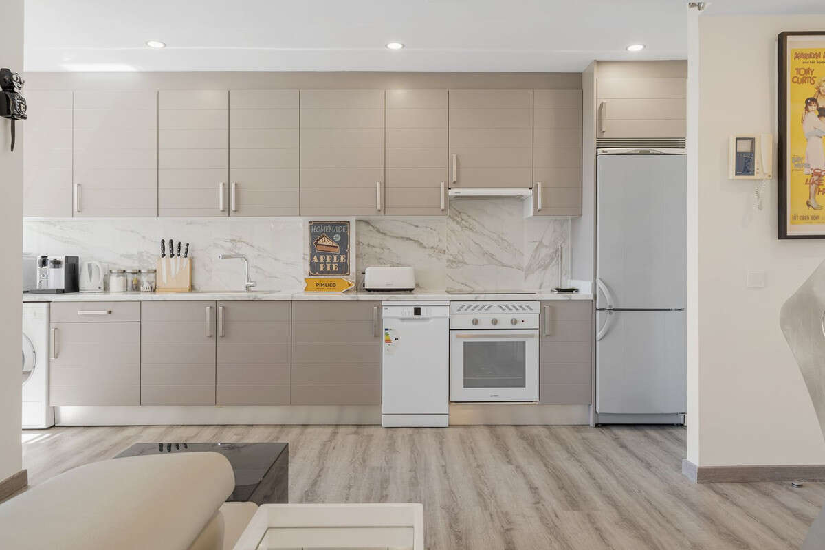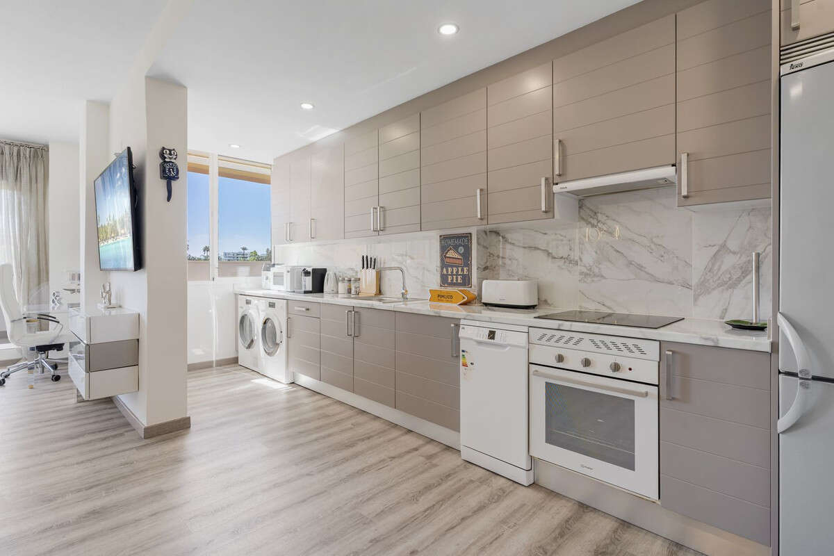 Enter into the open plan living room and kitchen area and feel instantly welcome and at home, this completely renovated and redesigned apartment, makes maximum use of the spacious and bright open plan space. The tasteful interior design and designer furniture are all included as seen, and the property is immaculate, ready for you to move in. The spacious living room is light and bright with double patio doors to the south facing covered terrace over looking the pool and gardens, a lovely place to relax. The large kitchen is fully equipped with lots of countertop and cupboard space, a handy seperate storage area and a large double window giving more light and open views across the La Cala neighbourhood. There is also a built in double cupboard at the entrance.