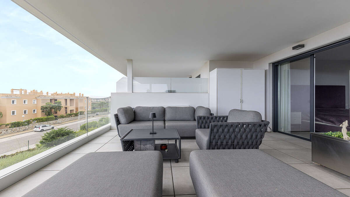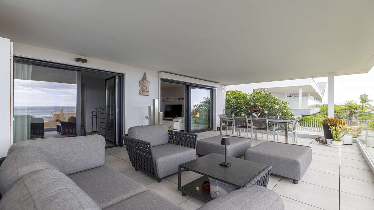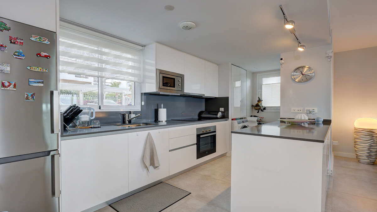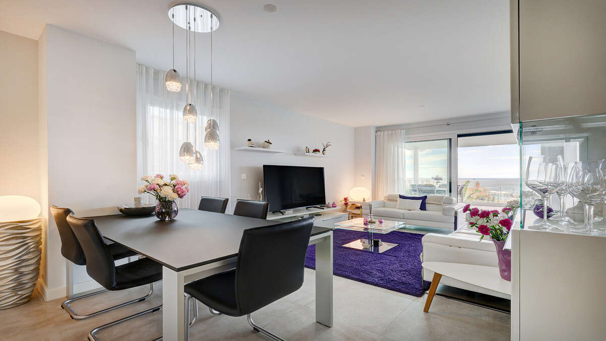 Straight ahead, the open-plan kitchen, dining, and living area is light-filled and modern, seamlessly leading out onto the large terrace, ideal for dining al fresco or enjoying the long, sunny Spanish afternoons while soaking in the stunning sea views.