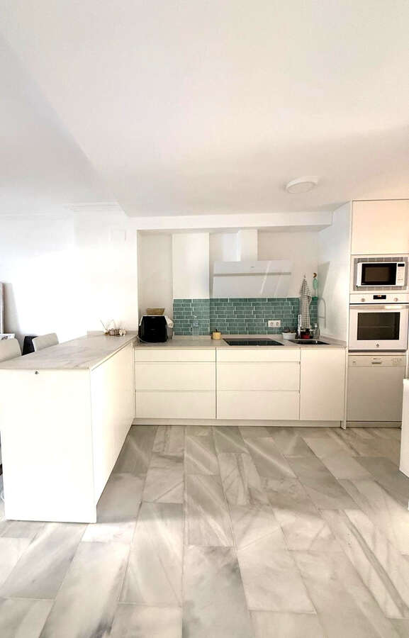 Inside, the property combines brightness and generous spaces with a modern and functional design. The living-dining room connects seamlessly with a designer kitchen fully fitted and separated by an elegant peninsula. The home offers three bedrooms, all with natural light and built-in wardrobes: