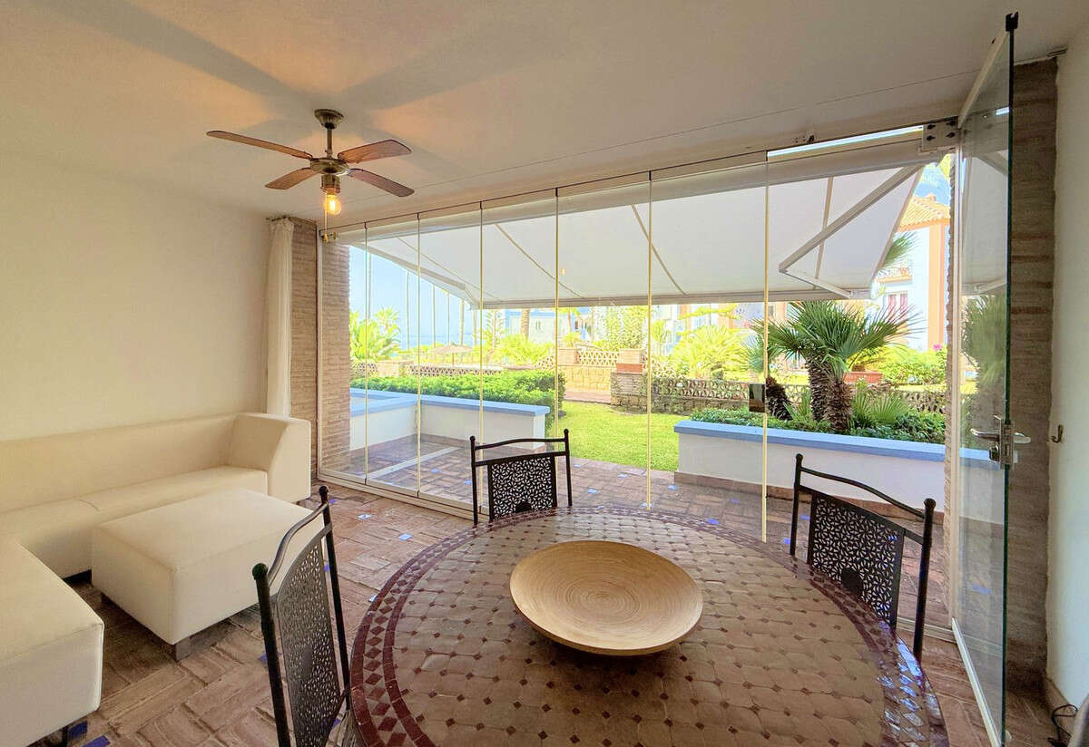 NEW TO THE MARKET: IMPRESSIVE FIRST-LINE BEACH APARTMENT, GROUND FLOOR, CORNER UNIT, with a PRIVATE GARDEN perfectly maintained by the community, offering SPECTACULAR VIEWS OF THE SEA, THE BEACH, GIBRALTAR, AND AFRICA. Located in the beautiful Bay of Casares, next to a protected historical area with an ancient Arab tower, within the stunning La Perla de la Bahía complex, beautifully designed by fusing Andalusian and Arab styles. Surrounded by lush gardens, magnificent pools (2 heated), a wide variety of decorative fountains, and relaxation areas designed for ultimate enjoyment. Only a 2-minute walk to 3 different beaches, 2 renowned restaurants, and the prestigious Finca Cortesín golf resort, which is awarded every year as the Best Golf Resort in Spain, is ranked among the 50 best golf courses in the world, and hosted the prestigious Solheim Cup competition in 2023, among others. Strategically located between Estepona and the charming Puerto de la Duquesa and the village of Sabinillas, all just a 5-minute drive away, offering access to a wide range of shops, restaurants, leisure activities, and different golf courses. The gated community offers 24-hour security and video surveillance, ensuring peace of mind and safety. This property includes 2 parking spaces in a garage and 1 large storage room. All of this makes it not only a dream residence but also an outstanding investment opportunity with high rental potential. A unique property that must be seen!