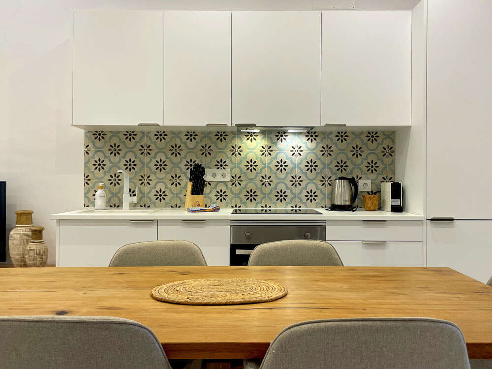 Recently renovated, the residence offers 110 m² of built area and comprises a bright living room with a fully equipped open-plan kitchen, three bedrooms, a study area, and two bathrooms, one of which is fitted with a washing machine and dryer. Large French windows provide access to a lovely private patio, flooding the home with natural light and enhancing the sense of elegance throughout the space. The property is equipped with air conditioning.