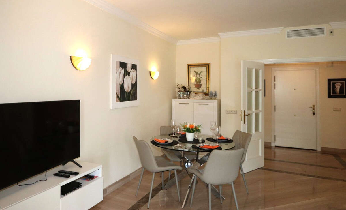 Excellent opportunity! Luxury apartment in one of the most sought after residential complexes in Elviria Hacienda Playa. The property is located walking distance to the beach (50 meters) and just a few steps from all services such as restaurants, banks, churches, schools, etc. This south facing apartment with a living area of 106 m2 + 62 m2 terrace consists of 2 bedrooms, 2 bathrooms, fully furnished and equipped kitchen, a large living room and a very sunny terrace. Air conditioning, hot / cold, Well maintained complex with communal gardens and pool. All this surrounded by beautiful tropical gardens. The apartment is in excellent condition and is very well maintained. An ideal option to enjoy life in Marbella right by the sea. The apartment includes an underground parking space and a basement room. 2 bedrooms, 2 bathrooms, living area 106 m2 + 62 m2 terrace, south facing. Built in 2002. This is the perfect home for a permanent holiday stay. Its position and features make it very attractive on the rental market.