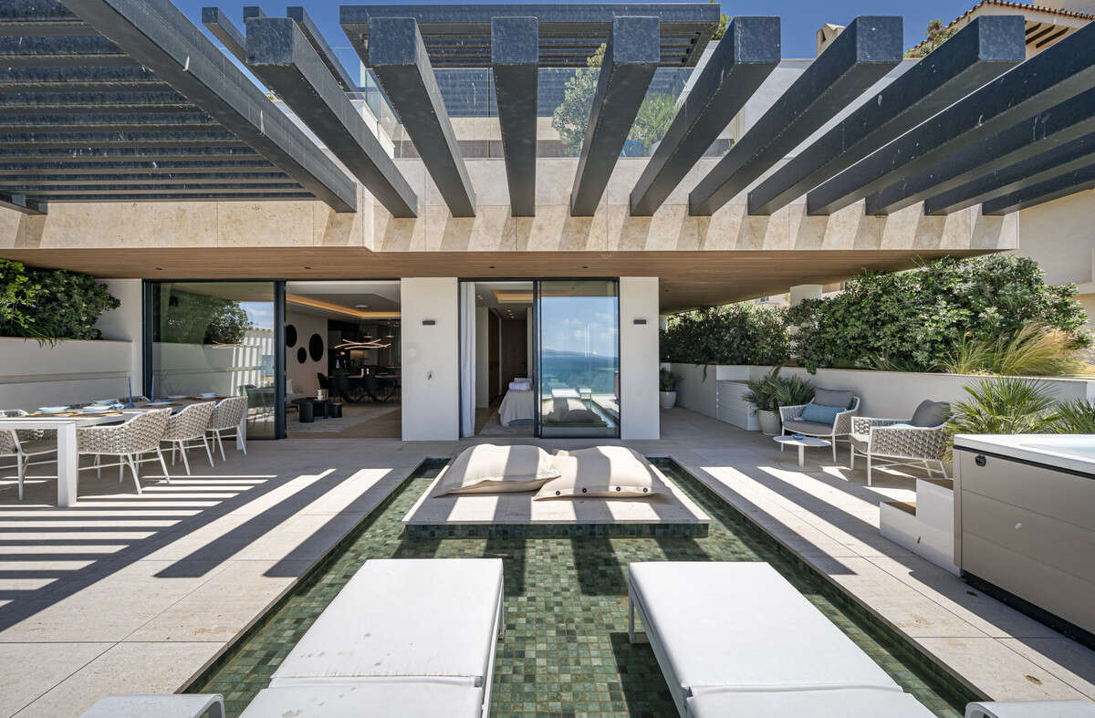 The expansive 102m² terrace is a standout feature, offering both covered and uncovered areas to enjoy the Mediterranean climate. Residents can indulge in a private pool, a jacuzzi, and a sauna, all complemented by access to a communal indoor pool and a fully equipped gym. The gated community provides 24-hour security with surveillance cameras and video entrance systems, ensuring peace of mind. Modern conveniences such as electric blinds, fibre-optic internet, satellite TV, and fitted wardrobes further enhance the living experience.