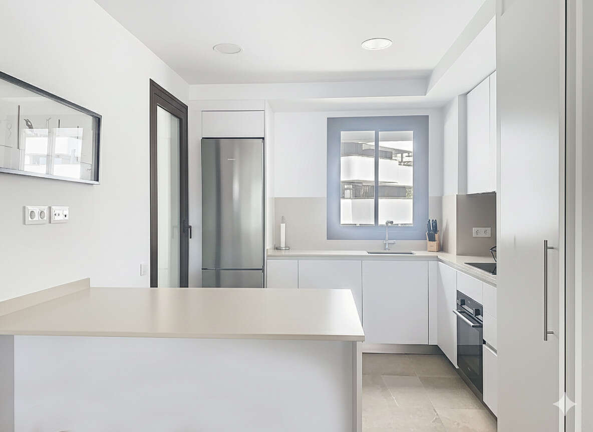 The main floor of the penthouse is designed for both comfort and practicality. The spacious living area benefits from porcelain floors, double glazing, and glass doors that open onto a private terrace, allowing natural light to flood the interior and providing urban and sea views. The open plan, fully fitted kitchen is equipped with modern appliances, a peninsula and includes a dedicated laundry room, making daily routines efficient.