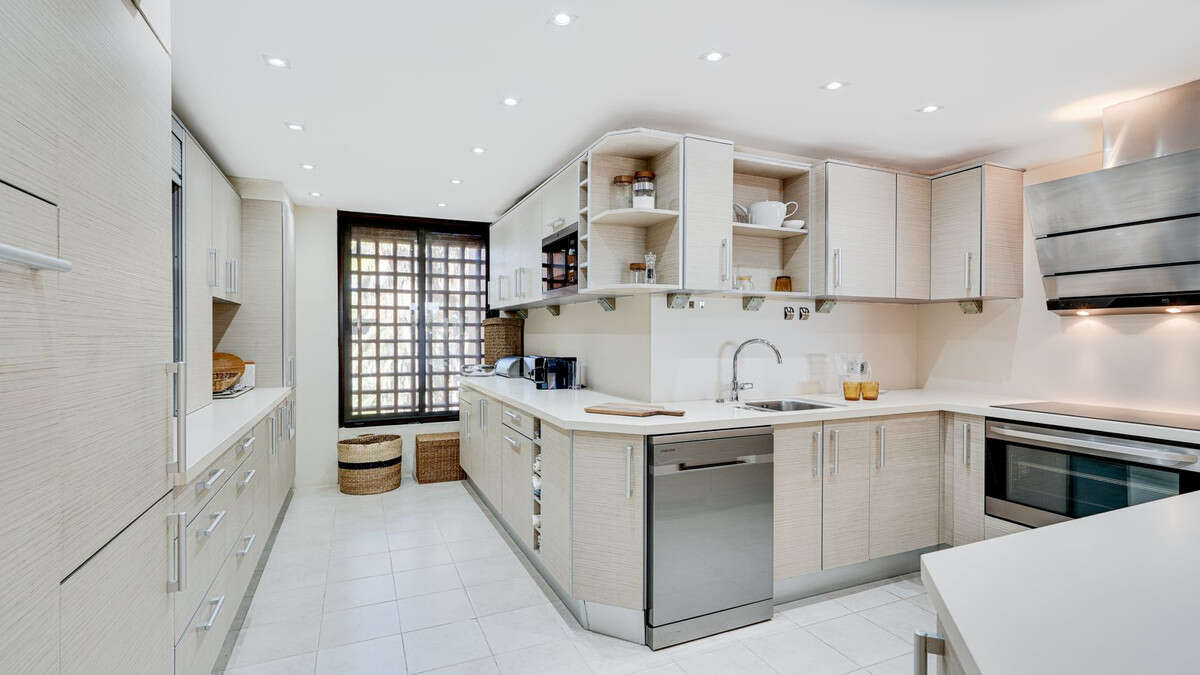 The separate kitchen is spacious and well-equipped, offering plenty of room for shared cooking and social gatherings.