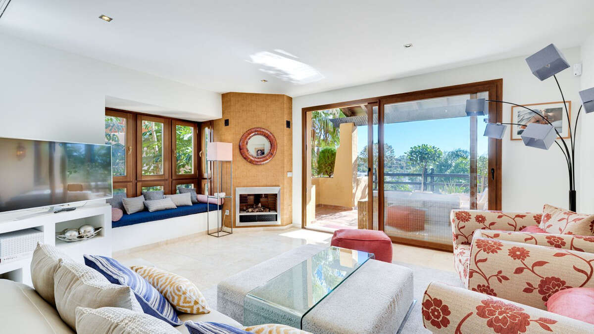 The bright living area with fireplace opens to another sheltered terrace with views of the greenery.