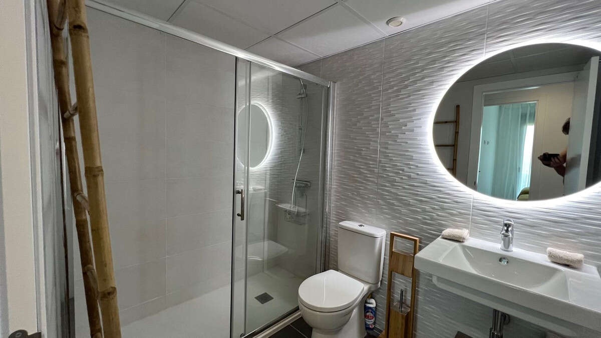 Newly Built Ground Floor Apartment with South-Facing Terrace (Year of Construction 2021) - Well-Positioned and PeacefulWelcome to this beautiful ground floor apartment, located in a tourist complex just 1.2 km from the largest shopping center on the Costa Blanca Norte (La Marina) and 3.3 km from the sea. Offering both convenience and tranquility, this property is an ideal retreat.The apartment features 2 bedrooms, both with access to the terrace, and 2 bathrooms with showers (including one en-suite with underfloor heating). Step out onto the spacious 40m2 terrace, where you can enjoy outdoor living and soak up the sun all year round. The open kitchen with an island is perfect for culinary enthusiasts, and the apartment also includes a large storage room and 2 underground parking spaces.This particular unit is the most practical in the complex, providing immediate car access to the storage room and the apartment's main entrance. For guests, there is a second entrance at the front (the terrace), leading to the garden and pools.The kitchen comes fully equipped with induction hob, oven, extractor hood, microwave, dishwasher, washing machine, and dryer. Each room is equipped with air conditioning, heating, and dehumidification systems, as well as recessed lighting, built-in wardrobes, and two high-quality double beds. Other notable features include electric blinds and an additional storage room. The apartment benefits from an energy-efficient hot water system using aerothermal technology.Fully furnished and ready to move in, this apartment is not only a wonderful place to live but also offers great rental potential, making it a smart investment opportunity.Facilities within the complex are exceptional and include:- Outdoor swimming pool- Children's pool- Indoor heated saltwater pool- Finnish sauna- Fitness room with equipment- Paddle tennis courts- Hiking trails- Lounge area- Children's playground- Beautifully landscaped subtropical gardensWith a low monthly cost of €115 (covering elevator maintenance, garden and pool upkeep, gym, paddle tennis, concierge, and electric gates), this cozy and high-quality apartment is certainly worth a visit.Location and Surroundings:Situated within a gated and monitored domain (with cameras, electric gates, and a concierge) in the "Camporrosso Village" complex, located in the coastal town of Finestrat.The stunning beaches, just a short bike ride or walk away, stretch over 6 km and are among the finest in Europe, boasting Blue Flag awards from the European Union for water quality, cleanliness, and provided services.If you're in need of relaxation and rejuvenation, the "Asia Garden" Hotel & Thai Spa is only 1 kilometer away. This award-winning spa hotel, favored by celebrities, transports you to Asia with its beauty and tranquility, offering a worry-free escape into paradise.The renowned 1-star michelline restaurant "Rice" is nearby, as well as the Villaitana Golf Club. Just a little further, you'll find a children's amusement park and a zoo.If you're looking to visit an internationally acclaimed wellness center, the SHA Wellness Clinic, a favorite among celebrities, is also within reach.For outdoor enthusiasts, a few minutes by bike will lead you to mountain biking trails on "Puig Campaña" or enjoyable mountain excursions.Finestrat is conveniently located between Benidorm and Villajoyosa. The charming and historic center of Finestrat sits atop a hill. There is a bus stop right outside the complex, and a tram stop at the nearby La Marina shopping center, which is less than 1.5 km away. The tram connects Alicante and Valencia, with stops in Albir and Altea
