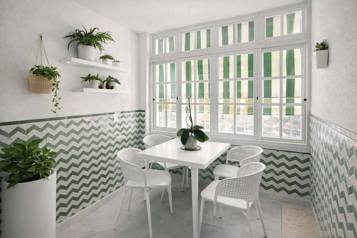The property features a spacious and bright living-dining room equipped with air conditioning, perfect for relaxing with family or entertaining guests. From here, you access a charming enclosed terrace, a versatile space that can be enjoyed all year round, adding extra natural light and living area.