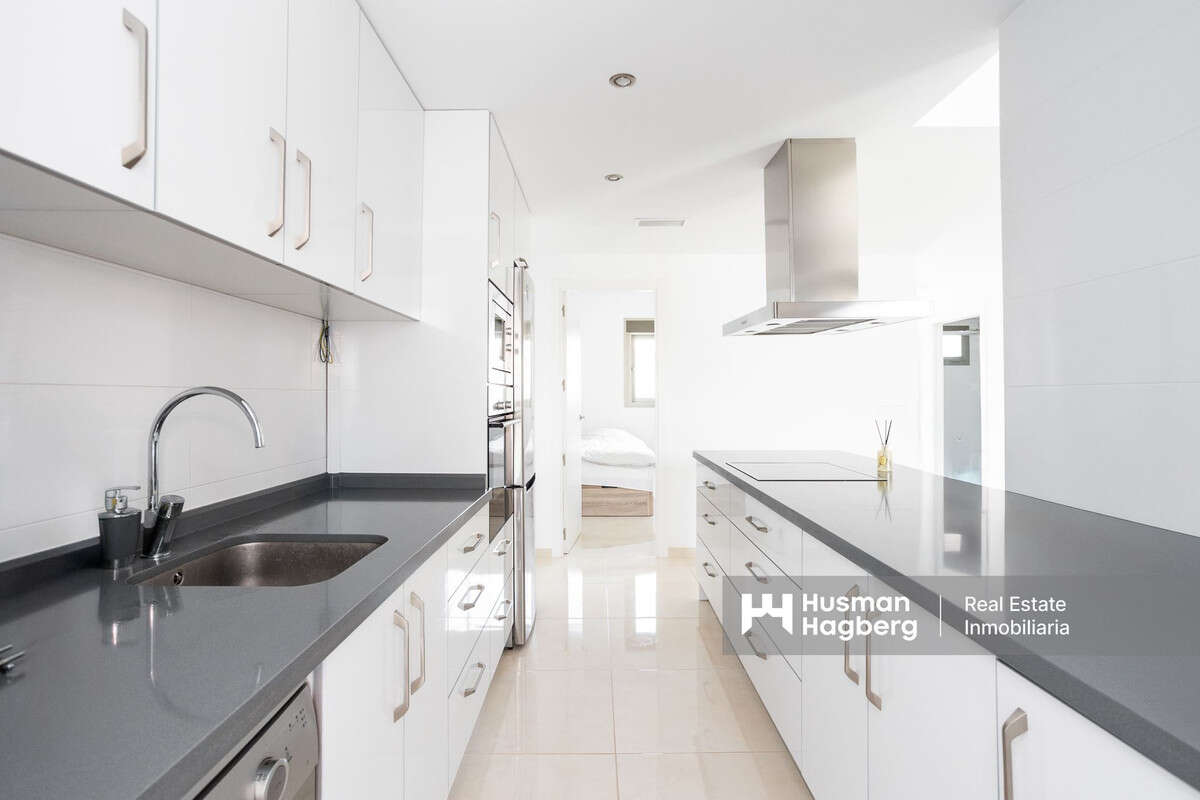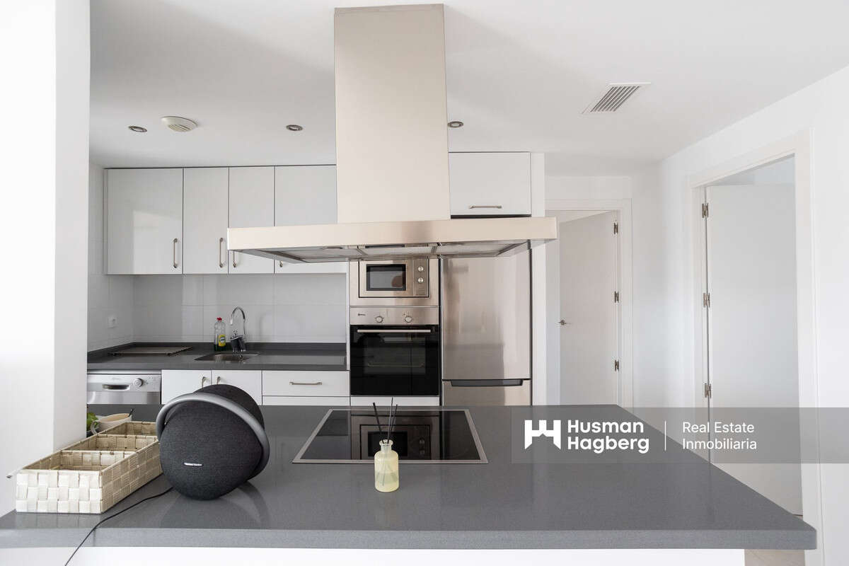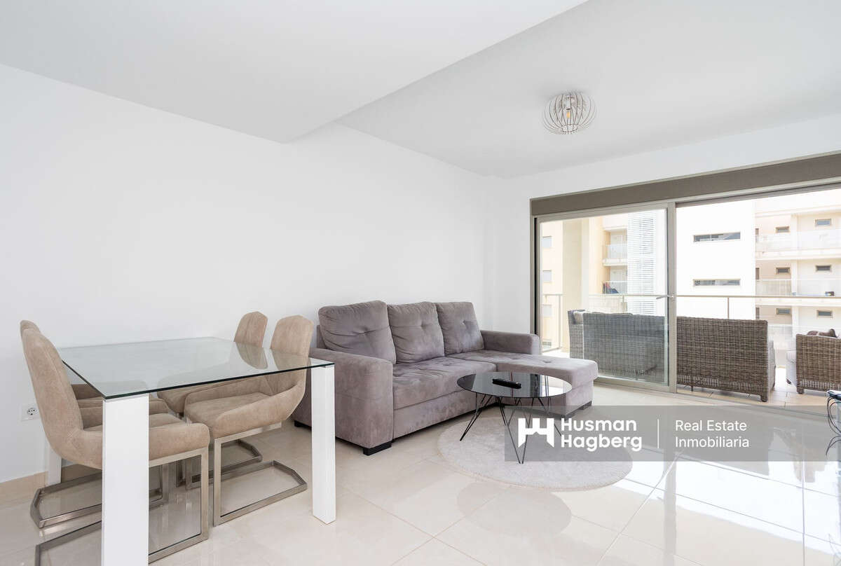 The home is located on the second floor of a stylish building with an elevator, and offers two spacious bedrooms and two fully tiled bathrooms with underfloor heating – a luxury that makes a big difference all year round. The open floor plan creates an airy flow between the fully equipped kitchen and the inviting living room, where large windows let in the warm, Spanish light.