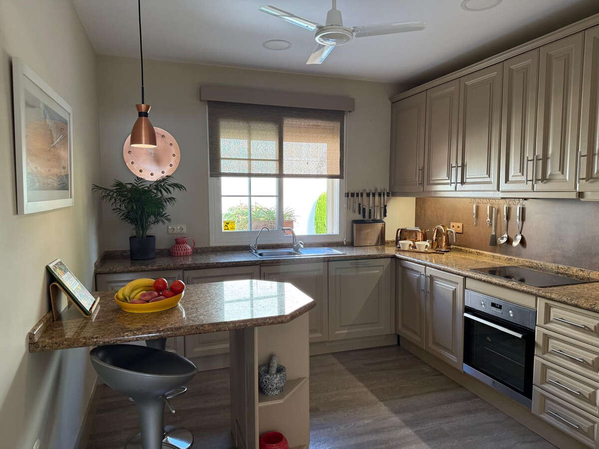 The fully fitted kitchen is equipped with high-quality appliances, including a fridge-freezer, integrated dishwasher, electric hob and oven, and a stainless-steel sink. Ample granite countertops and a practical breakfast bar make this kitchen as functional as it is stylish.