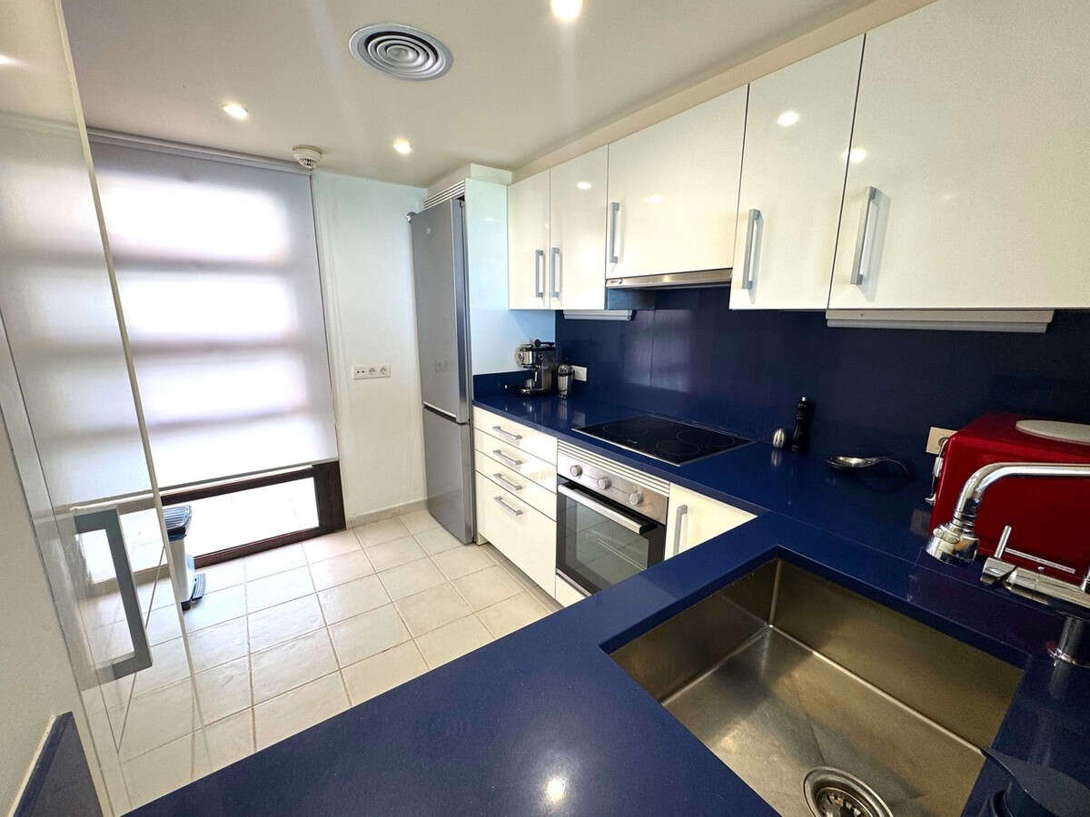 Inside, the spacious apartment opens into an inviting hallway with the fully fitted kitchen immediately to the left. The kitchen features ample storage, vibrant worktops, modern appliances, and an opening through to the bright and airy lounge and dining area. Floor to ceiling sliding doors frame incredible views over the resort, the coast, and the Mediterranean Sea.