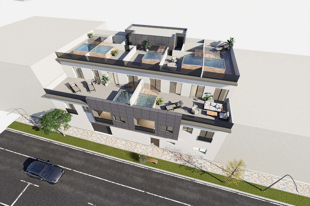 This development is designed with 7 apartments of 1, 2 o3 bedrooms and 1 or 2 bathrooms with fully equipped kitchens including electrical appliances and pre-installation of ducted air conditioning. The houses are distributed by floors: 1 ground floor apartment with 3 beds, 4 first floor apartments with individual solarium on the roof of the building with 1 or 2 bedrooms and 2 penthouses of 3 bedrooms with private terrace. In addition, jacuzzi is included and garage space for each apartment and lift from the ground floor to the third floor