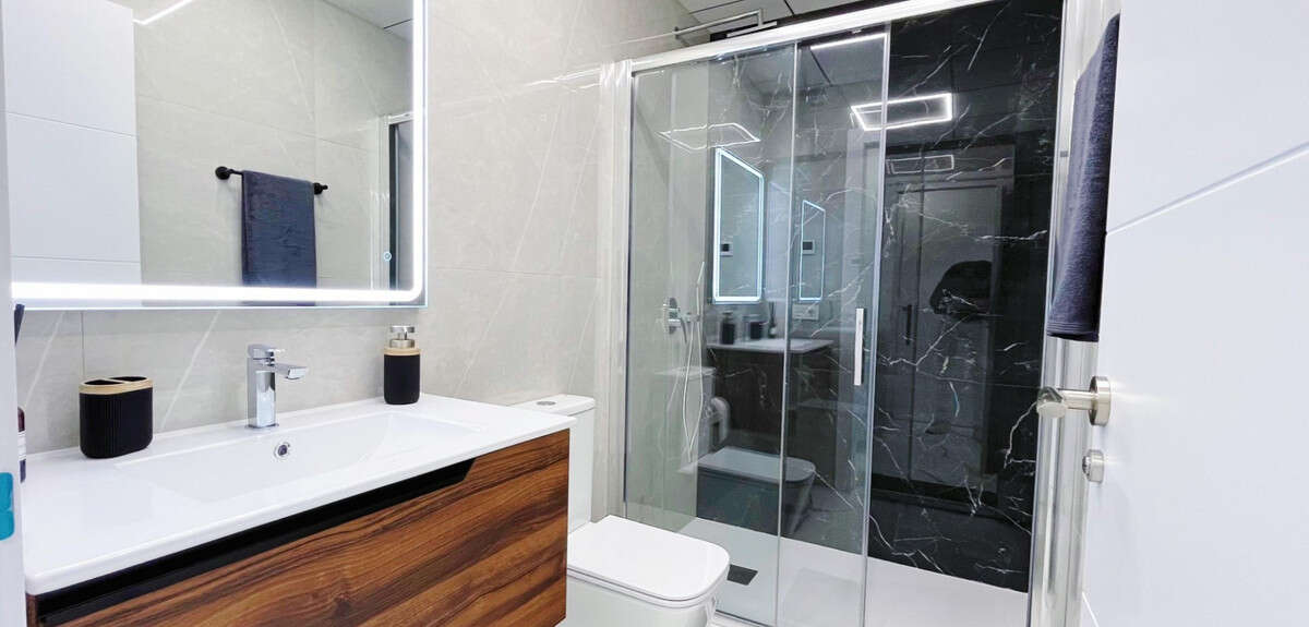 The two bathrooms are finished with high-end ceramic and marble-look tiles, LED-lit mirrors, and walk-in glass showers for a touch of hotel-style comfort.