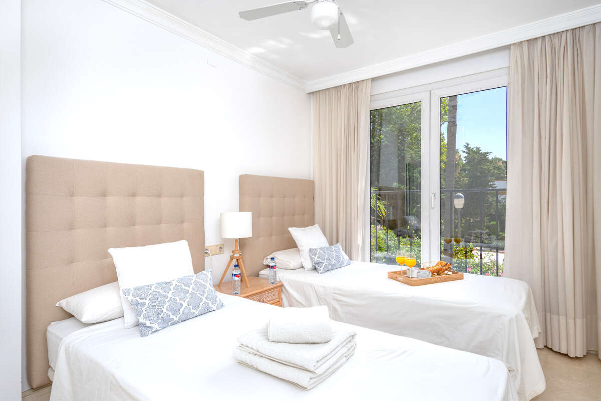 Excellent three bedroom, first floor apartment on Marbella's Golden Mile, in the sought after frontline beach community Las Cañas Beach, with 24hr security service, several communal swimming pools and tropical gardens. As well as being only a short walk to many bars, shops and restaurants. Casablanca Beach, one of the best on the coast, is just outside the front door. The apartment has a spacious open plan living and dining area with French doors leading out to the private terrace which is enclosed with glass curtians; fully fitted kitchen; master suite with access to the terrace; two guest bedrooms and a guest bathroom. Other features include hot and cold air conditioning, fitted wardrobes and underground parking space.