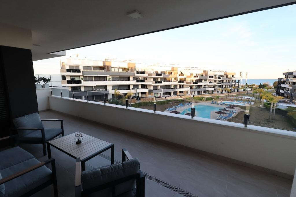 Playa Flamenca, Residencial Amanecer de Luxe: Second-floor apartment (81 m2) with sea and pool views. Features 2 bedrooms, 2 bathrooms (1 en-suite), and an open-plan kitchen/living area leading to a large terrace. Includes storage, garage, and access to a gym and BBQ area. Sold fully furnished.