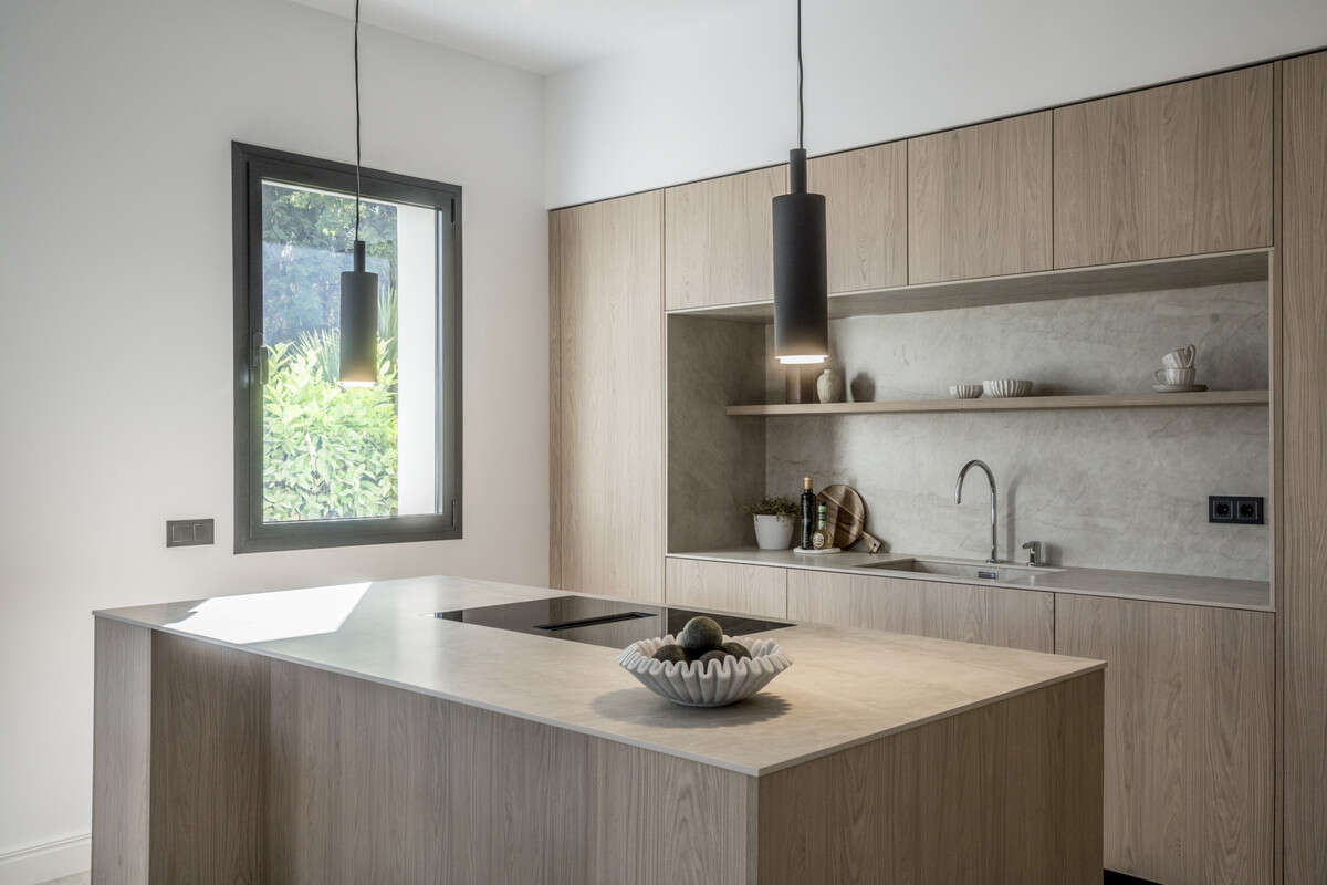 Entering the living area, you are greeted by a bespoke kitchen that exudes both elegance and functionality. It features stunning deep wooden accents on the island and cupboards, complemented by a soothing ‘Taj Mahal' marble countertop. With ample storage, generous counter space, and a wine cooler, it is a modern kitchen that is incredibly functional for those who enjoy cooking and gatherings. The living room area is warm and inviting, featuring a majestic TV-wall with a spacious bench that offers ample storage.