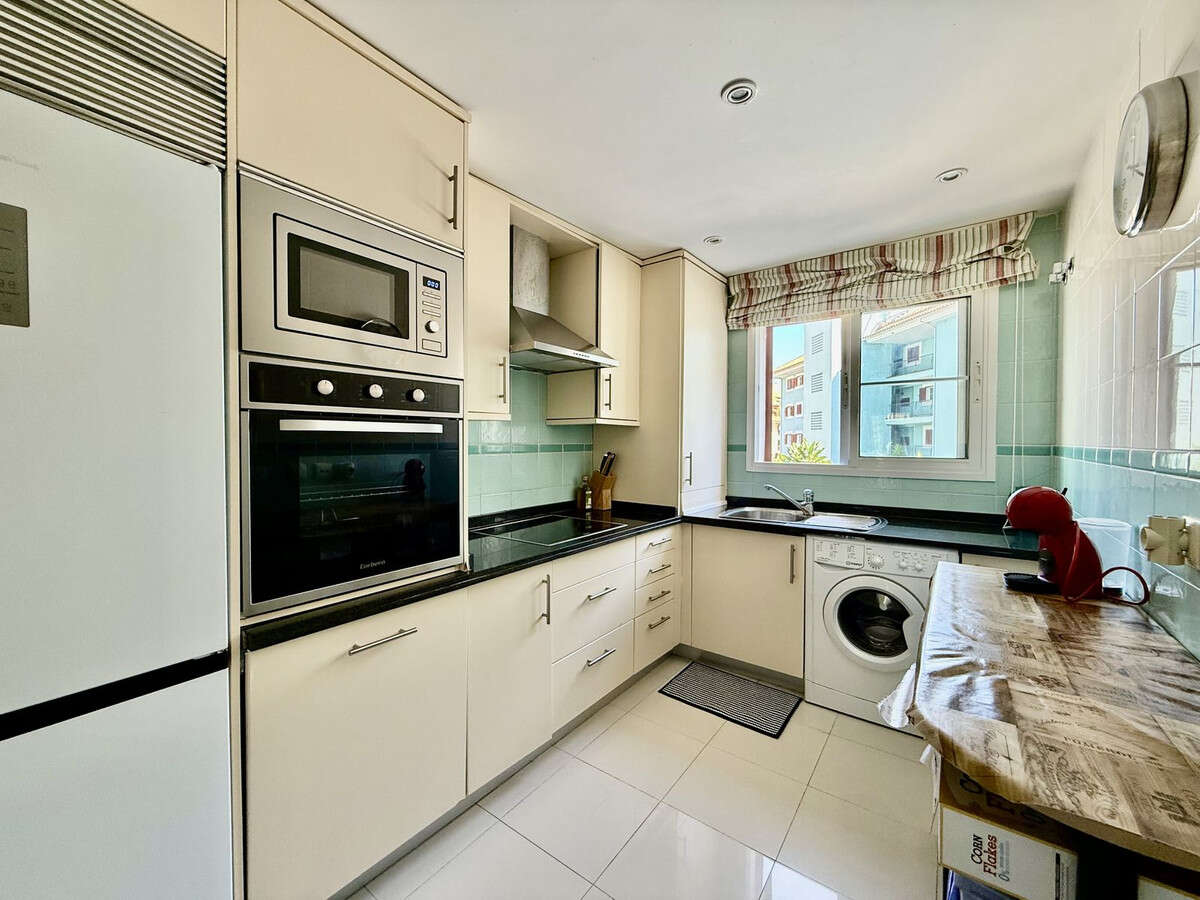 The property features a spacious living-dining area with direct access to a large private terrace overlooking the port — perfect for enjoying the Mediterranean lifestyle. Fully equipped open-plan kitchen, modern and functional.
