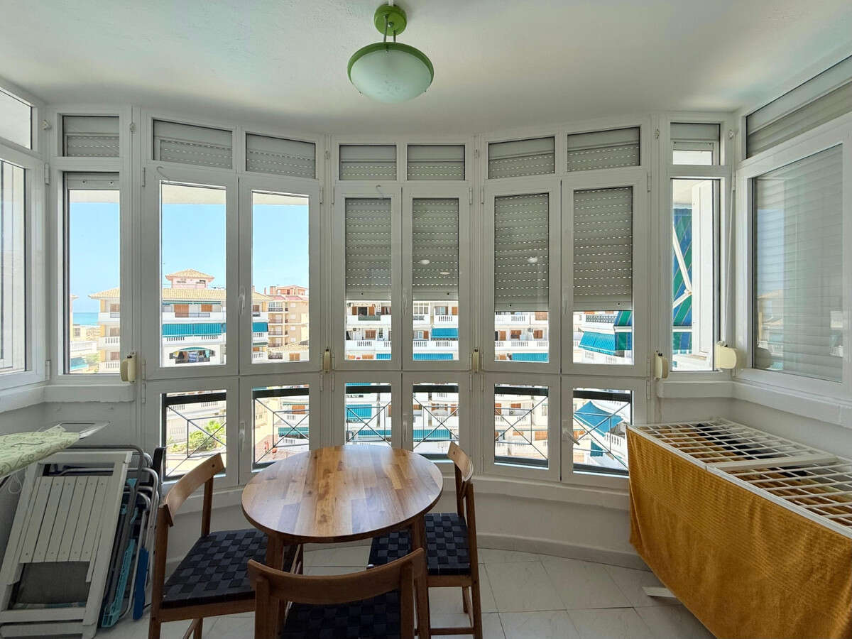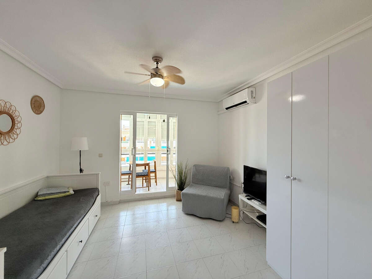 Beautiful and well-maintained studio apartment for sale on the 5th floor in the sought-after Viñamar VI residential complex in La Mata. Located in a gated community with a communal swimming pool and underground garage.