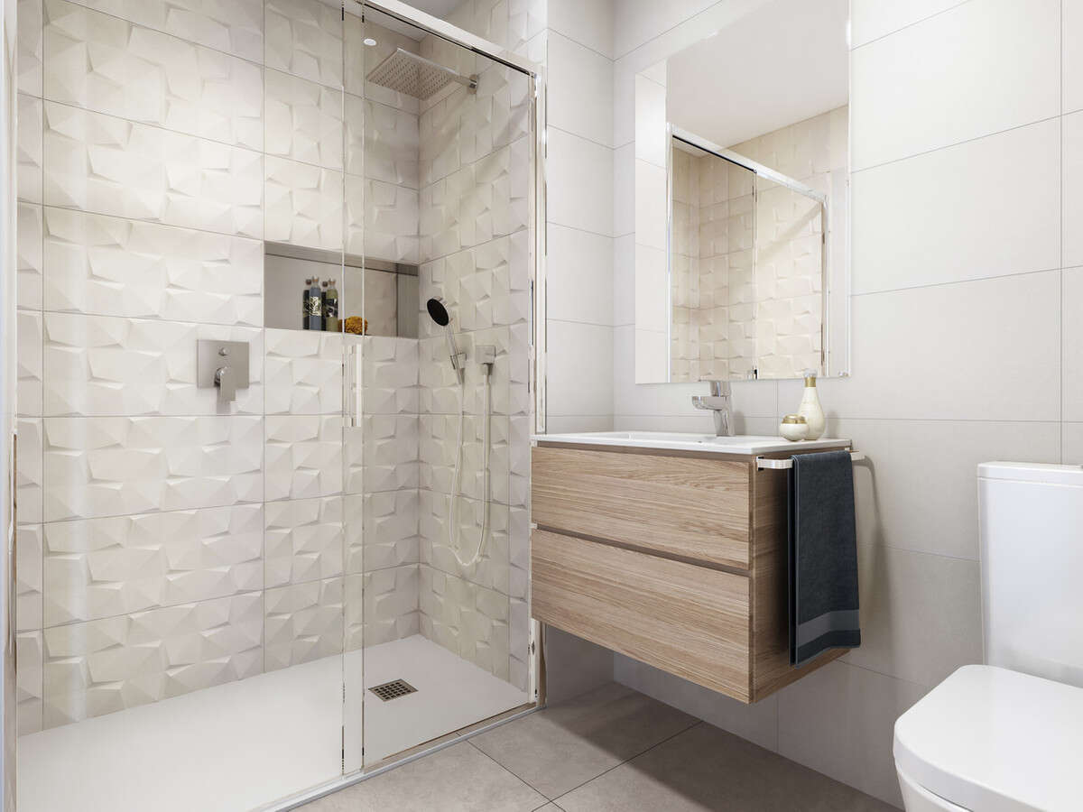 Bathrooms finished with a mix of white and wood-look porcelain tiles.