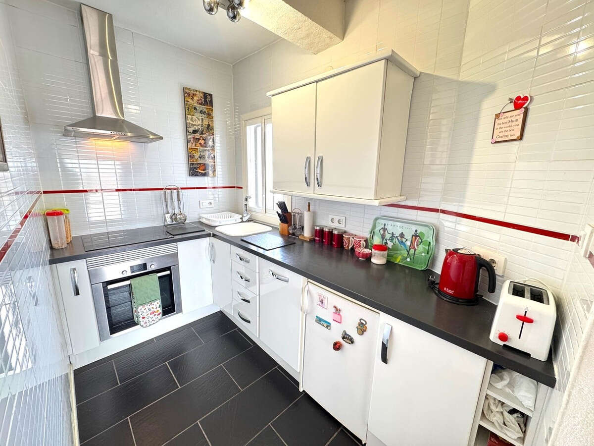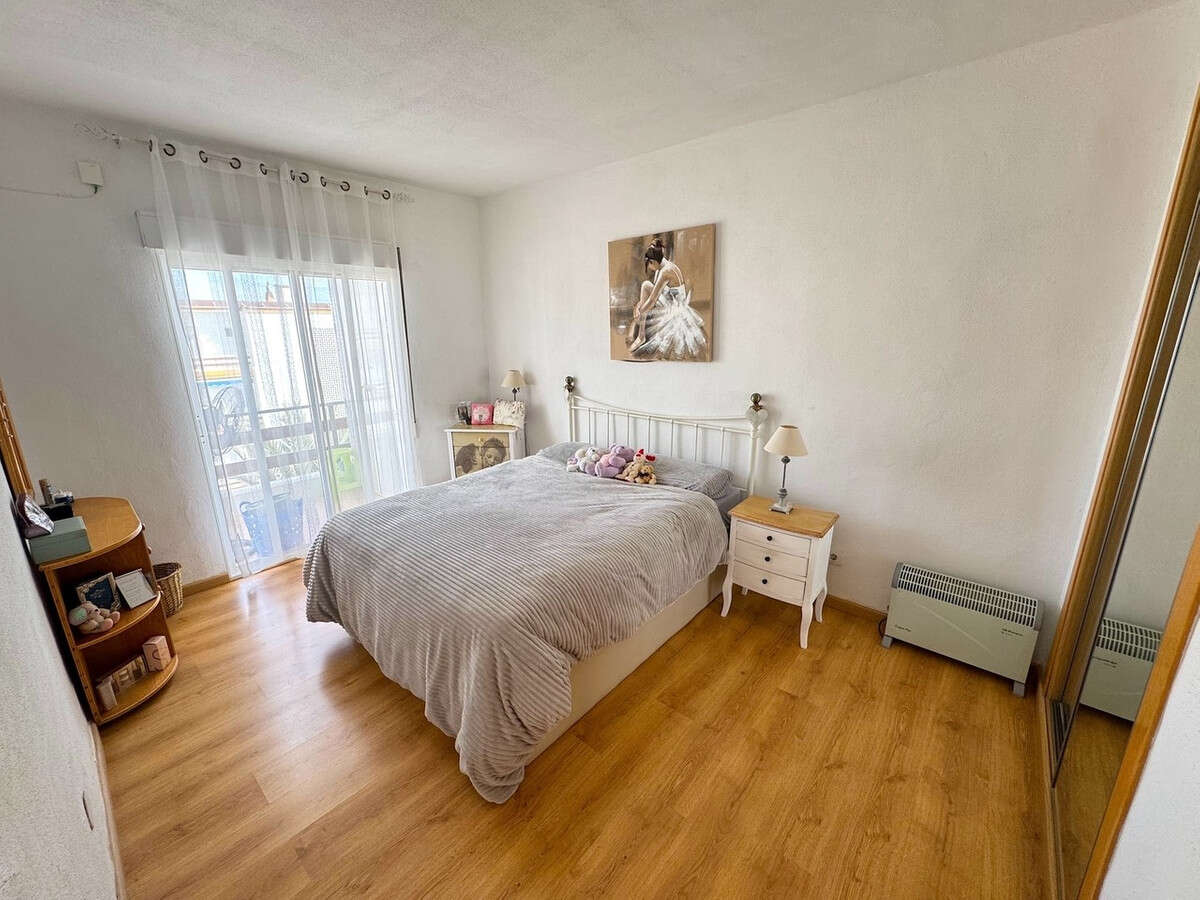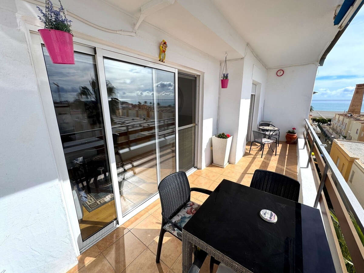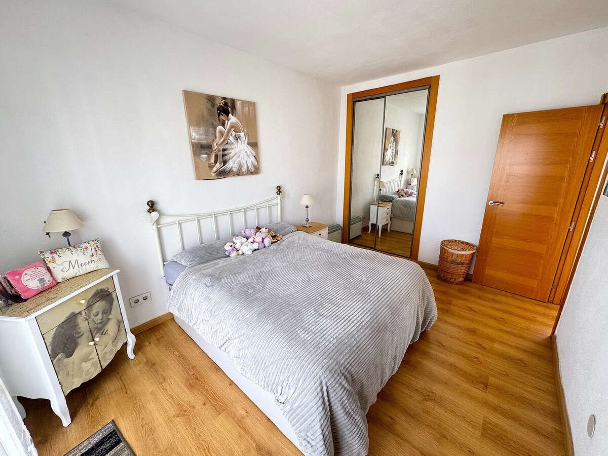 The spacious lounge and dining area is filled with natural light, thanks to large patio doors that perfectly frame the stunning views. The apartment benefits from new wooden flooring throughout and an air conditioning unit. From the living area, there is direct access to the terrace, which offers ample space for both seating and dining while enjoying the sunshine and sea views.