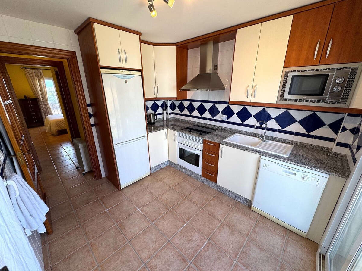 The kitchen is larger than typically found in similar properties within the community and offers ample storage units, integrated appliances, and access to a separate utility terrace, which can also be used for additional storage.