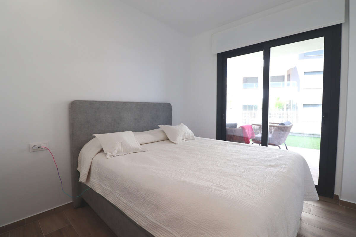 This Modern, Two Bedroom, Ground Floor Corner Apartment in Villamartin is located within a highly sought-after, beautifully maintained gated community, just a 10–15 minute walk to a variety of bars, restaurants, and Greenlands Mini Golf. Villamartin Golf Course is only a few minutes' drive away, with the popular La Zenia Boulevard shopping centre reachable in 10 minutes and the stunning beaches of the Orihuela Costa in 10 minutes also. This stylish apartment features a bright, open-plan living space with a fitted, modern and classy kitchen, complemented by a separate utility area. Both double bedrooms have access to the terrace and built-in storage, with two sleek shower rooms, including one en suite to the master. The property also boasts a private garden area laid with low-maintenance astro turf, ideal for relaxing or entertaining. Additional features include ducted air conditioning throughout, an allocated parking space, and access to a lovely communal pool — all located in the heart of Costa Blanca South.\n