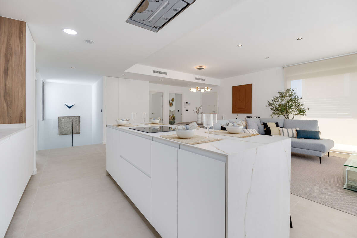 The kitchen boasts high and low lacquered cabinets with grey interiors and matte white doors, a Neolith (or similar) countertop (color TBD), an undermount sink with a single-lever faucet, and an aerothermal system with a 150-liter hot water tank.