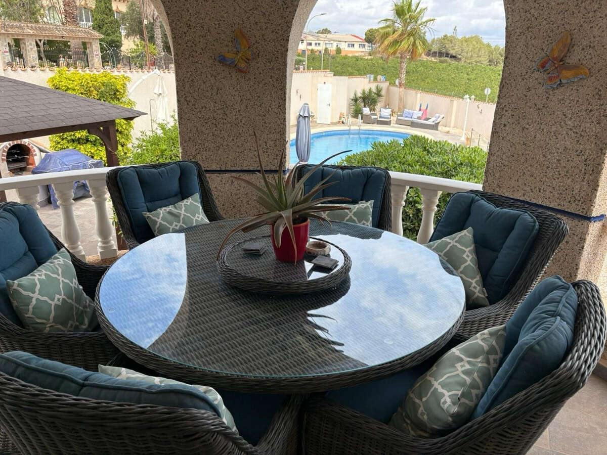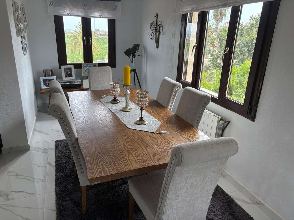 For sale is a stunning detached villa located in the tranquil area of Algorfa. This beautiful resale property boasts a generous internal space of 375 square meters, featuring five spacious bedrooms and four modern bathrooms, perfect for families or those who enjoy entertaining.