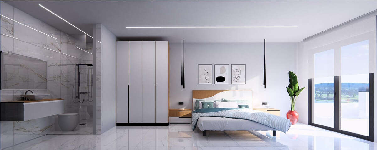 The main entrance opens onto a spacious living room, which incorporates the open-plan kitchen and connects to the porch and paved garden, creating continuity between the interior and exterior. The sleeping area is distributed through a small hallway, which gives access to two bedrooms and two full bathrooms. The master bedroom has an en-suite bathroom, while the second bedroom shares a bathroom with the common area.