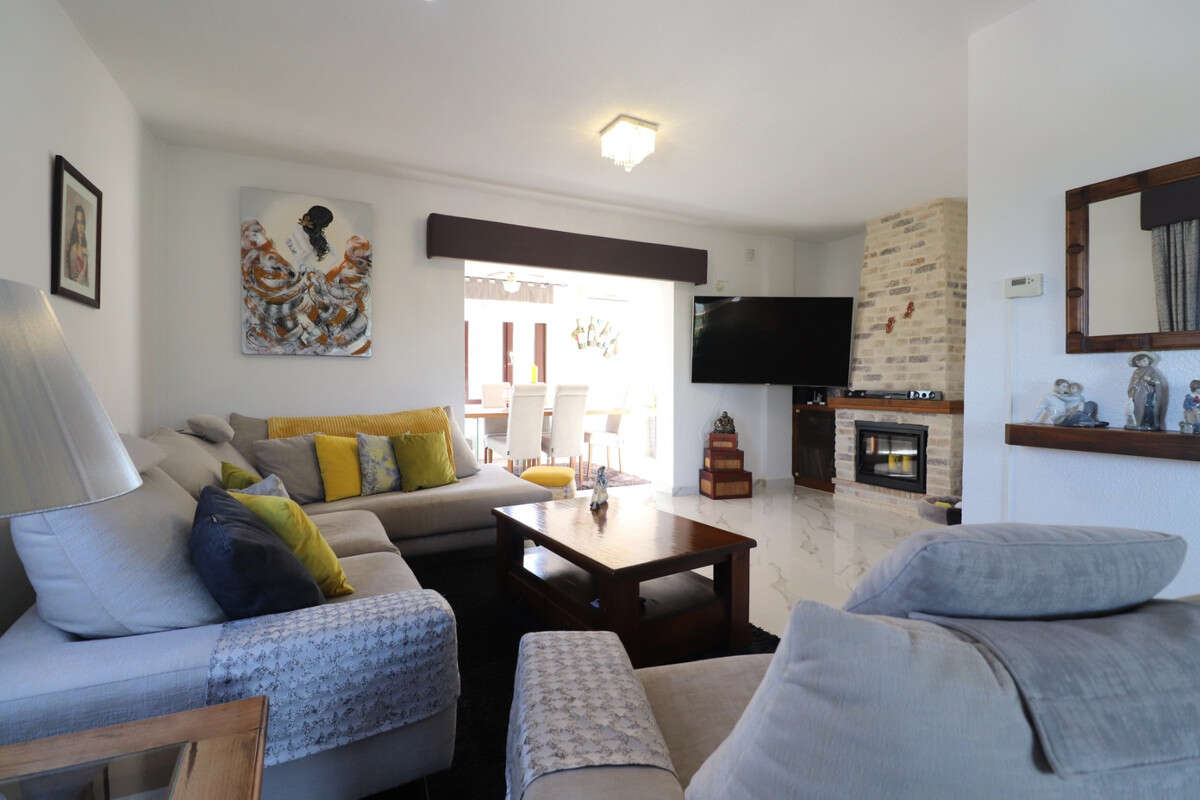 This Remarkable, West Facing, Corner, Five Bedroom Detached Villa in Lomas de La Juliana is located in a prominent position on the Costa Blanca South, under the area of Almoradi but closer to and conveniently situated between Algorfa village and the prestigious La Finca Golf, Hotel & Spa Resort. With a tennis club just at the top of the road and main brand amenities only a few minutes' drive away, the blue flag beaches of Guardamar del Segura are also just 15 minutes away! This incredible property spans an impressive 375m² build size on a stunning 1,149m² plot, offering panoramic views of the countryside, citrus groves, mountains, and sunsets. The main villa has been fully updated and modernized, retaining its character and charm, and includes three bedrooms and three bathrooms. Upon entering, the hallway leads to an open-plan, fully fitted kitchen with a breakfast bar, a spacious family-sized living room with a cozy log-burning fireplace, and direct access to the large front covered terrace, perfect for appreciating the breathtaking views. There's also a dining room with rear garden access, a shower room, and two bedrooms on the ground floor, one with an en-suite bath and shower. The upper-level master bedroom features a walk-through wardrobe, dressing table, and an en-suite shower room. The separate annex, located in the under-build, provides two additional bedrooms and a bathroom, accessed via the double garage or independently from the rear. This space includes a separate kitchen and dining area, a large bedroom with a living area and office, plus an en-suite shower. The garage is currently used as a games room with a pool table, ping pong, utility space, and an adjoining storeroom. Outside, the gravelled and tiled garden features an updated private swimming pool, a BBQ area, a small putting green, and ample space for outdoor dining and entertaining. Additional highlights include a carport, off-road parking, oil central heating, air conditioning throughout, ceiling fans, fitted wardrobes in the main villa, and dual entrances from different roads. This is an extraordinary opportunity to own a substantial and versatile property with fantastic views in an enviable location!