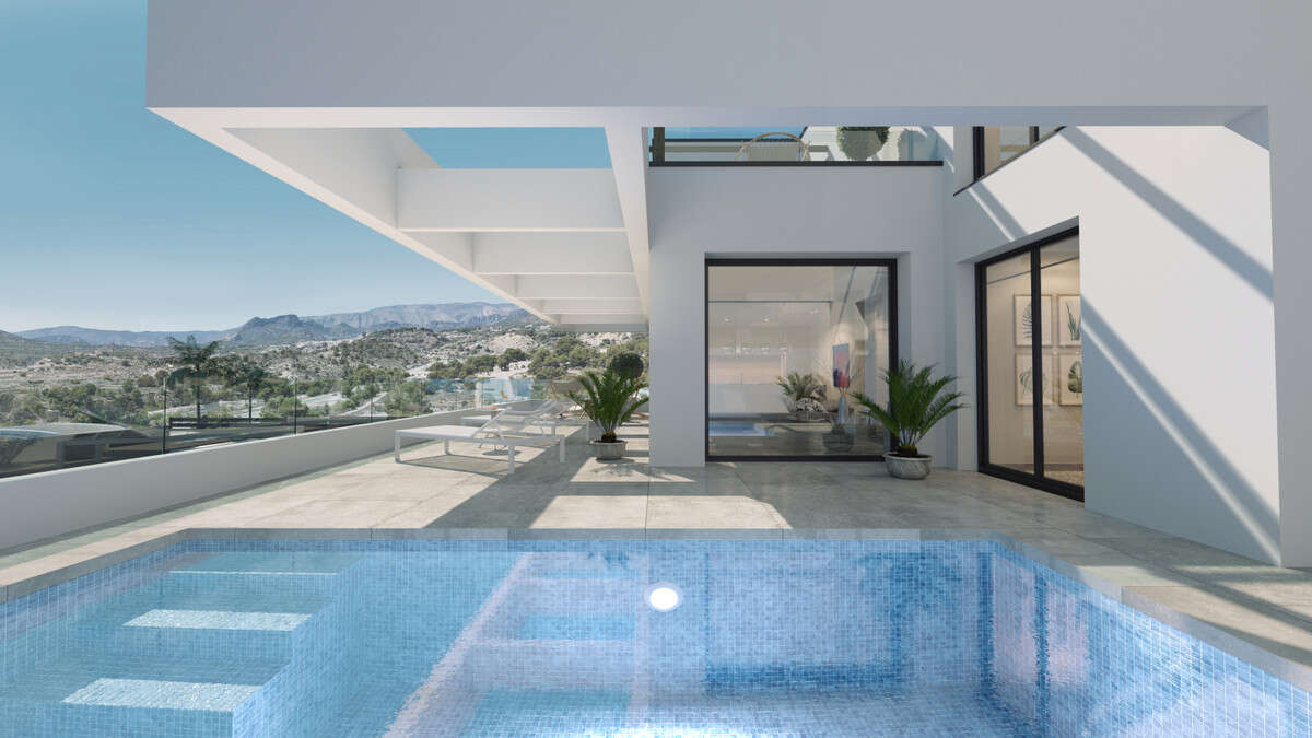 This development is a new project of 10 modern design villas, in a natural environment with views of the sea and the mountains, next to the Puig Campana golf course, and a short distance from the towns of Finestrat and Benidorm.
