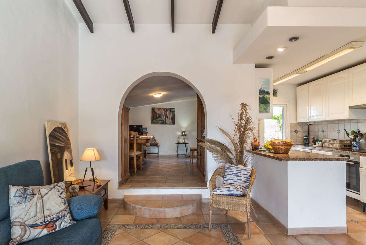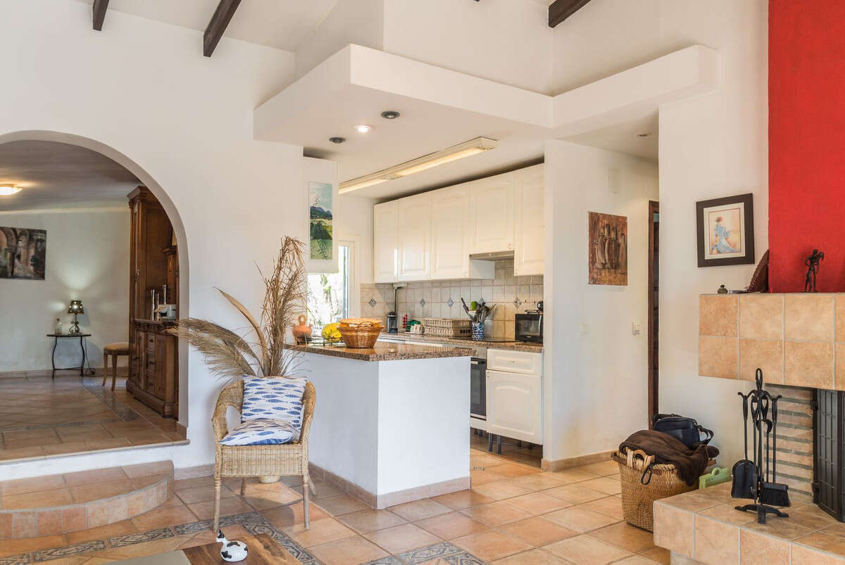 Inside, the house offers a cozy open kitchen connected to a spacious living-dining area. A wood-burning fireplace, exposed wooden beams, and Andalusian-style arches add warmth and personality. The property also features air conditioning, ensuring comfort throughout the year.