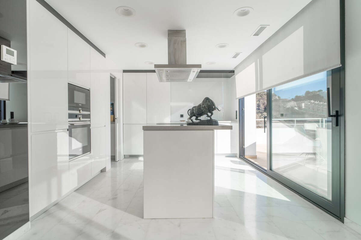 An open-plan kitchen and dining area with high-quality appliances and direct access to the terrace.