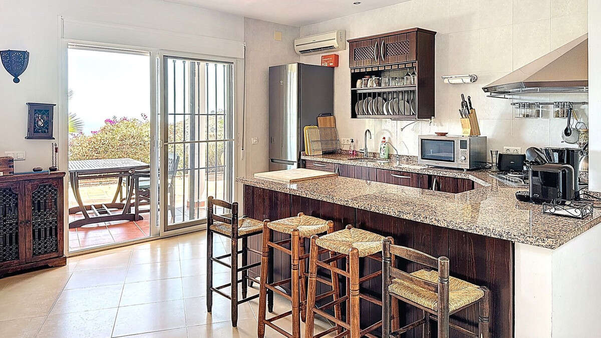 Are you dreaming of a life under the Spanish sun, surrounded by peace, space and ultimate comfort? This bright and elegant villa, located between Vélez-Málaga and the charming village of Arenas, offers exactly that. With panoramic views over the lush valley and the shimmering Mediterranean Sea, you can enjoy the very best of Andalusia every single day. Large sliding doors in the living room, dining room and modern open-plan kitchen flood the interior with natural light and open directly onto the covered terrace, where outdoor living blends seamlessly with indoor comfort. The inviting living room with its fireplace creates a cosy atmosphere on cooler evenings, while air conditioning ensures a pleasant climate throughout the year.