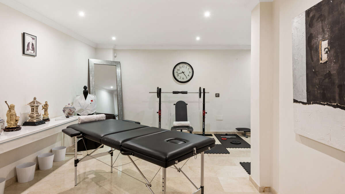 Further from the entrance hall we have a guest WC, a gym area and a 2nd lounge area with access to the cozy covered terrace with view over garden and pool area.