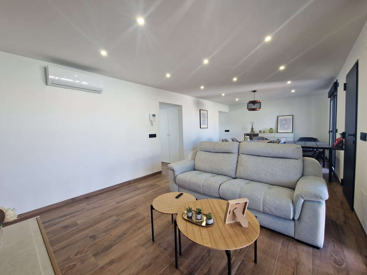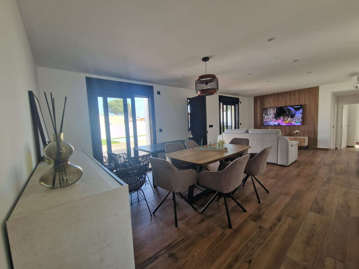 A brief description of the property: you enter the large open planned living-dining room with the independent modern kitchen towards the rear. Sliding glazed doors lead directly to the swimming pool area, perfect for entertaining guests. Benefitting from being all on one level, the bedrooms and bathrooms are towards the front of the property offering easy access for a family to reside in. Comes with air-conditioning throughout.