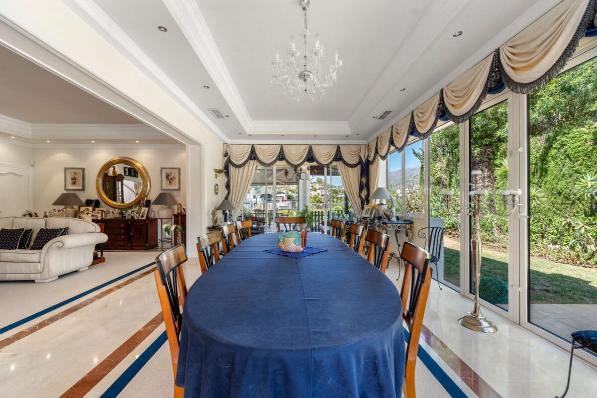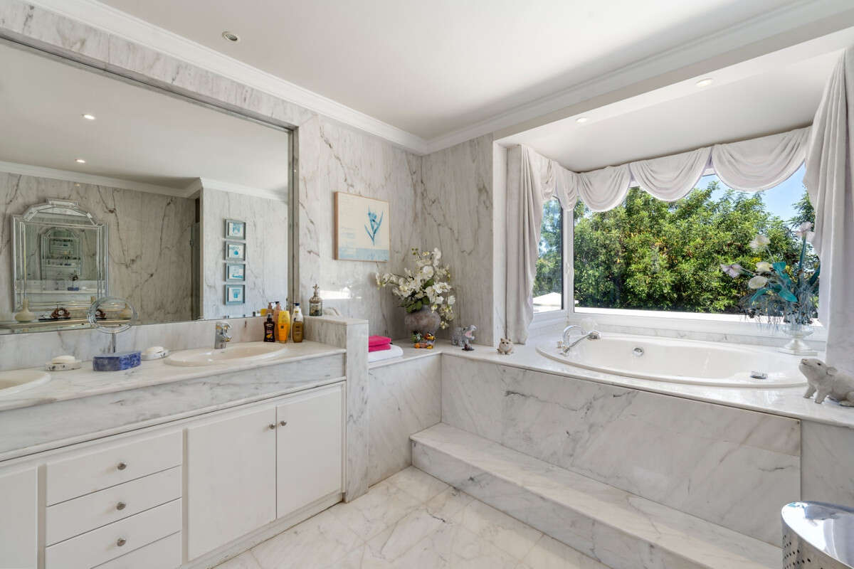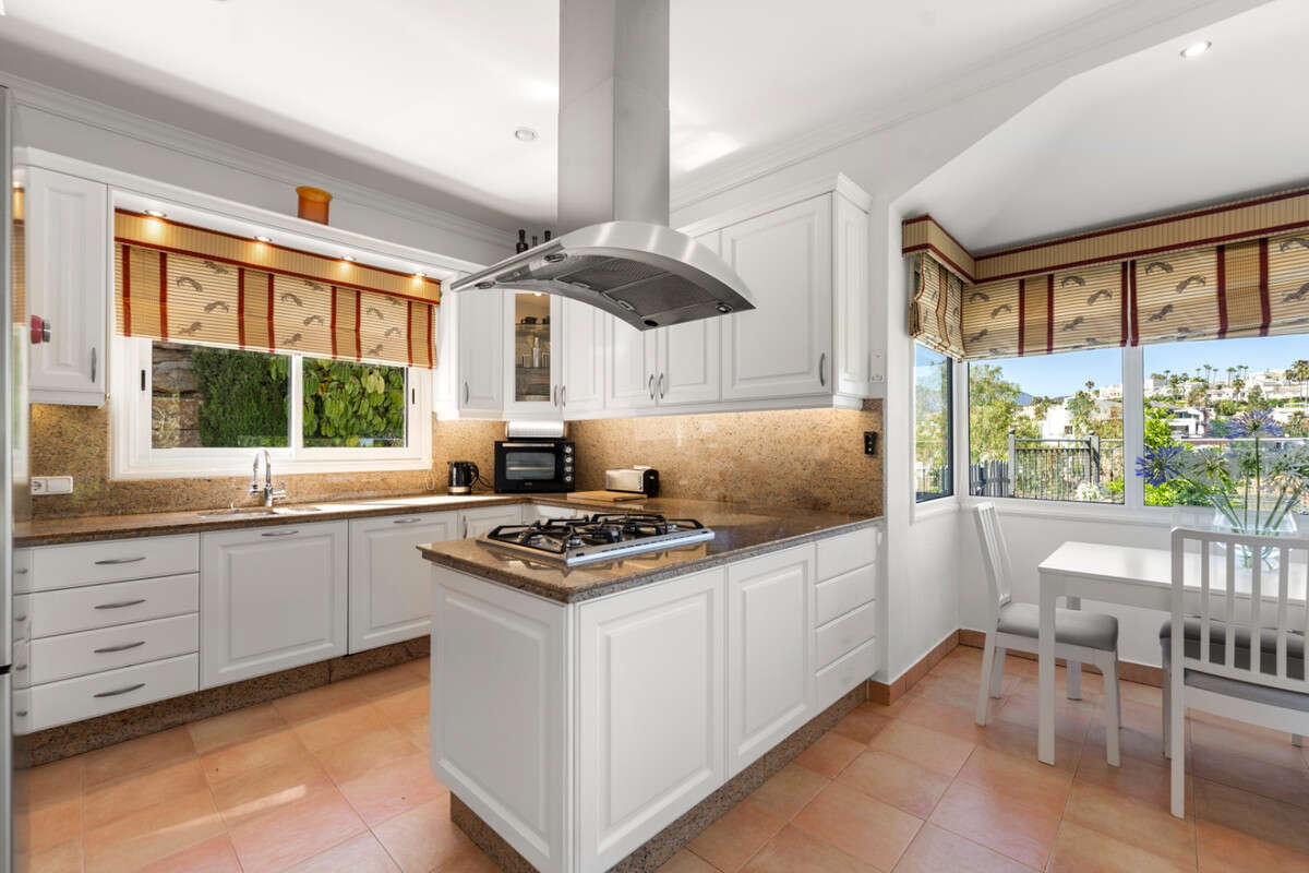 On this ground floor the kitchen is open, airy and takes in magnificent views across the golf valley and over to La Concha mountain, looming majestically in the background. Decorated in warm golden tones alongside crisp whites, the kitchen is naturally illuminated by expansive windows along one side. In one corner the breakfast area is embraced by these windows, making this the perfect place to sit for breakfast, and enjoy the valley view. There is also a comprehensive laundry room, fully equipped with a fridge/freezer, sink and a myriad of cupboards and drawers, guaranteeing an impressive amount of storage space.