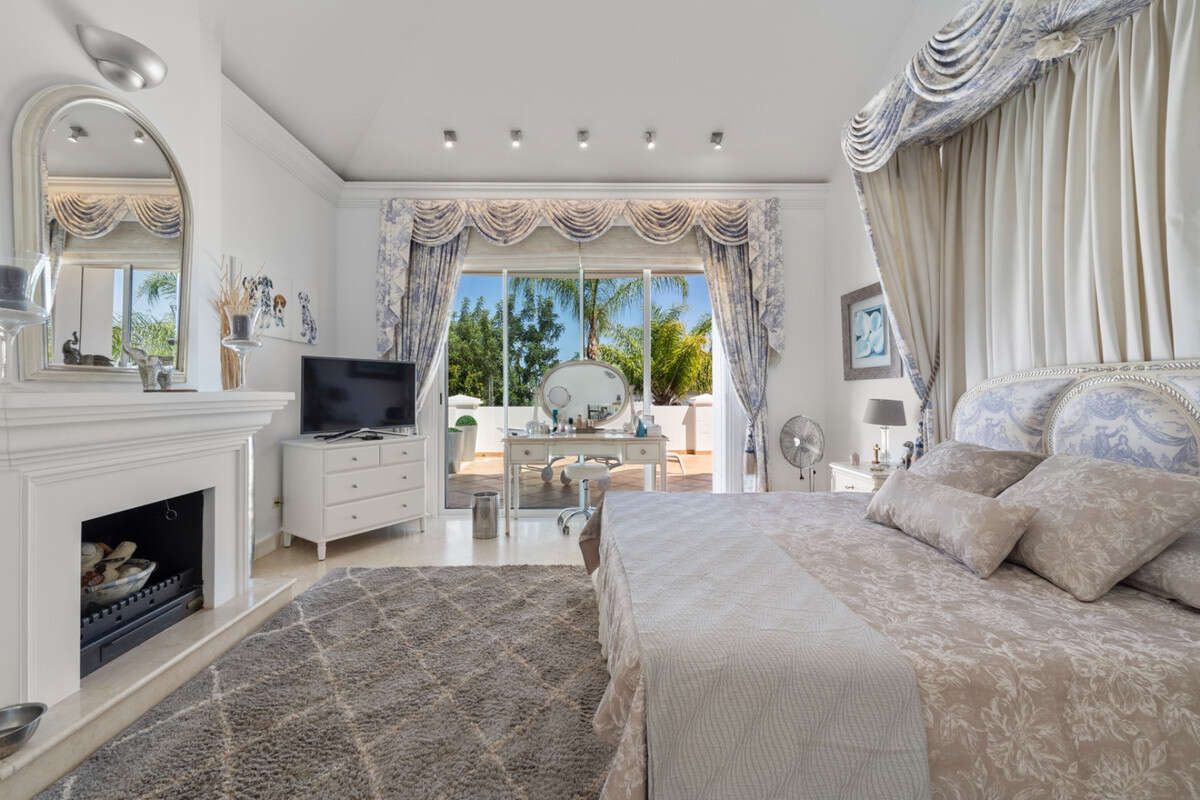 On the first floor there are two further bedrooms. The first is sumptuous with its furnishings in soft neutral tones. Brightly lit by swathes of natural light filtering in through glass terrace doors, the effect is dazzling. With an open fireplace taking centerstage in the bedroom, a vast walk in wardrobe in crisp white wood, leading through to a huge bathroom ensuite, this is a haven of privacy and relaxation. Double sinks and an elevated bathtub surrounded by windows, the bathroom is as colonial as it is traditional.