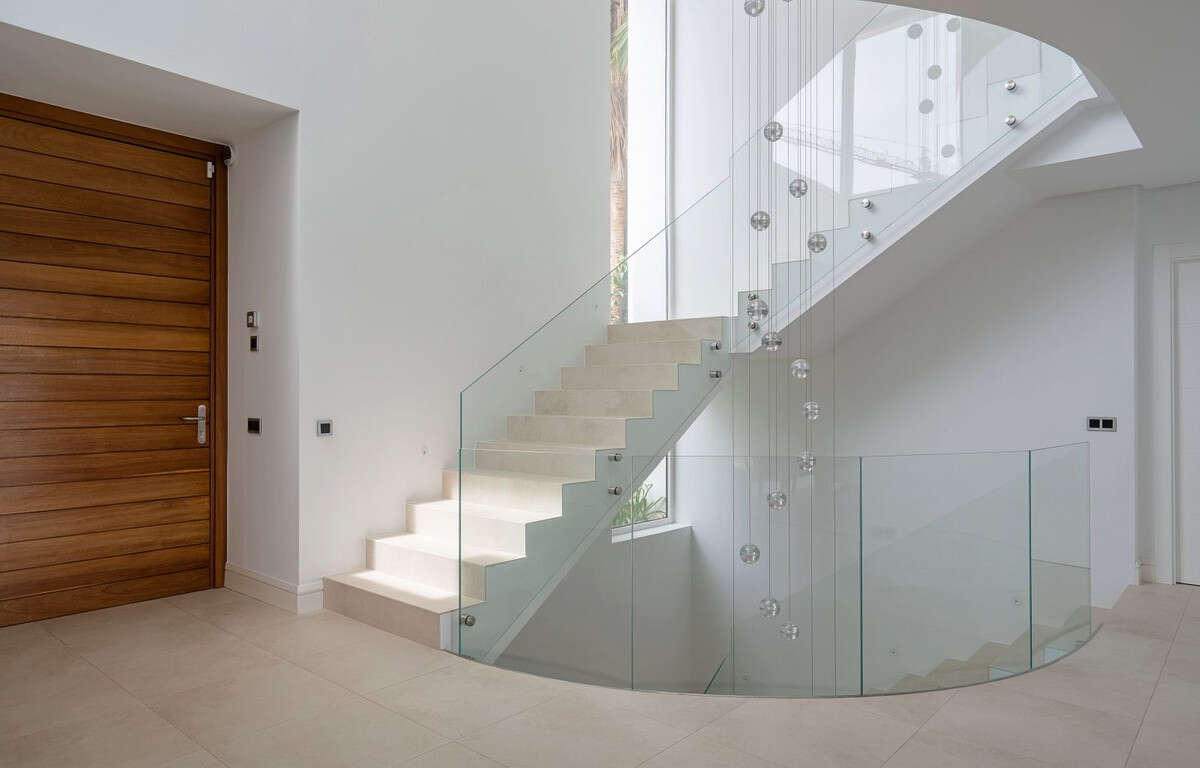 The grand entrance hall with its striking open staircase leads into a spacious, open-plan living and dining area. Floor-to-ceiling windows flood the space with natural light and open onto a covered terrace with direct access to the garden. The contemporary, fully fitted kitchen includes a separate pantry, a dining space, and a breakfast area with views over the garden and surrounding landscape. This level also offers a generously sized bedroom with en-suite bathroom and a guest WC.