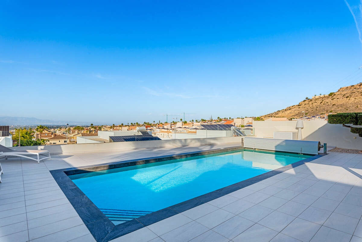 This impressive property, designed and built by a renowned Belgian project developer, is constructed with high-quality materials and exceptional craftsmanship. The villa has 4 spacious bedrooms and 2 family bathrooms, one of which has a bathtub. Upon entering, you're greeted by a spacious living room with high ceilings and an abundance of natural light streaming through large sliding windows. These windows can be fully opened, seamlessly merging indoor and outdoor spaces, allowing you to fully enjoy the beautifully landscaped garden, mountain views, and private pool. The open-plan kitchen, carefully integrated into the living room, creates a functional and stylish connection between the indoor and outdoor spaces. From the living room, you have direct access to the terraces and garden, which offer versatile areas for relaxation and complete privacy. Main features of the villa: Fully equipped kitchen. Separate utility room and storage room. Air conditioning (heating and cooling). Outdoor storage space, ideal for bicycles or other items. Private pool with heat pump for year-round enjoyment. Automatic pool cover with 6x heating effect. Parking space for two cars. Electric access gate. Location: Situated on the edge of a charming Spanish village, the property is just 1 km from all essential amenities. The Mediterranean beach of Guardamar del Segura is just a 13-minute drive away, and there is a golf course nearby. Alicante Airport is easily accessible via the AP-7 or N-332. This villa is perfect for those who value peace and comfort while staying close to a vibrant neighborhood. Don't hesitate to contact us to experience this remarkable property for yourself.