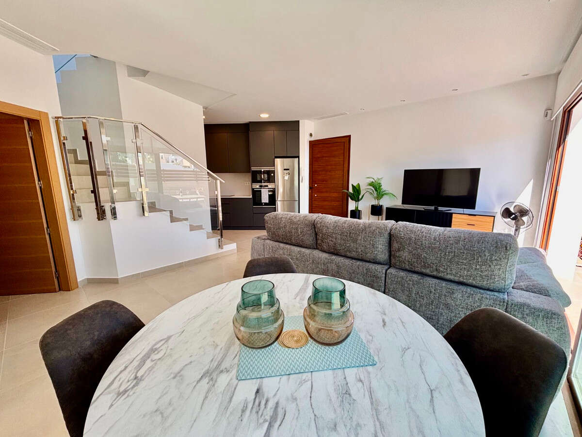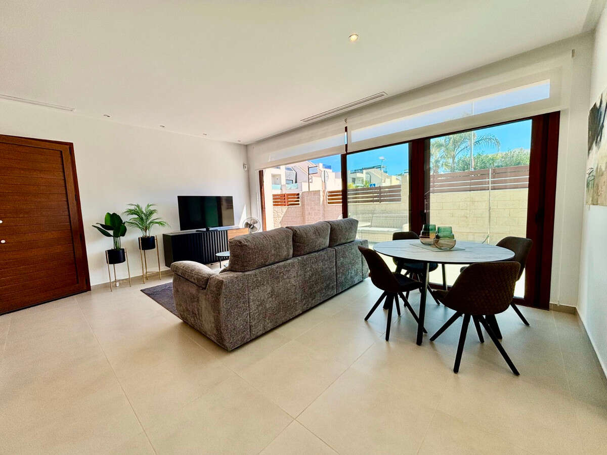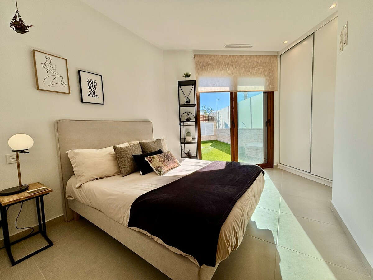This Very modern, Three Bedroom, Detached Villa in Benijofar is located just a few minutes' walk from the nearest shops, bars and restaurants, with the stunning beaches of the Costa Blanca South only a 12 minute drive away. This contemporary 131m² villa, set on a 226m² plot, features a bright lounge/dining room with air conditioning that opens through double glazed sliding doors to the garden — perfect for enjoying your morning coffee or evening meals in the summer. The open-plan fully fitted kitchen is complemented by a separate utility room. All three double bedrooms include built-in wardrobes and air conditioning, with all three benefiting from en-suite bathrooms/ shower rooms. One ground floor bedroom opens directly to the garden, while a first floor bedroom has sliding doors leading out to a private solarium. A ground floor toilet provides additional convenience. The property also offers a private swimming pool, a low-maintenance garden with irrigation system and a private solarium with views over the private garden, private pool and town. Off-street parking completes this stylish and modern home. A fantastic opportunity for a holiday home, rental investment or permanent living in a central yet peaceful location on the Costa Blanca South.