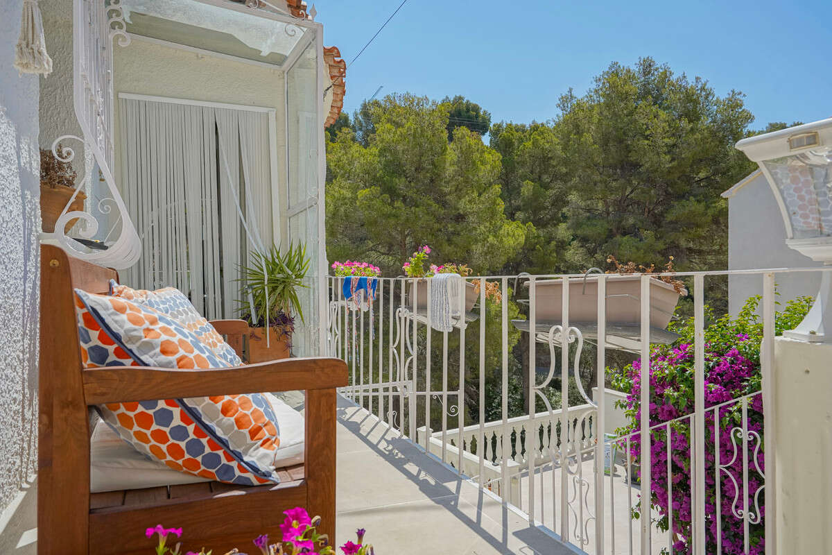Discover this charming, renovated villa in traditional style, located in the quiet and green urbanization of Montemar in Benissa. Only 2 kilometers away from the beautiful beach of La Fustera and surrounded by natural areas, this property offers ultimate privacy, tranquility and a pleasant Mediterranean lifestyle. The villa has a total built area of 420 m2 and a usable area of 219 m2, distributed over two floors. Through the pedestrian entrance you reach the upper floor where the main house is located. Here you enjoy a spacious, bright living room with large windows and views of the surrounding nature. Adjacent you will find a dining room and a fully equipped open kitchen. Furthermore, this floor has two comfortable double bedrooms that share a bathroom. Outside you will find an attractive barbecue area, ideal for enjoying summer evenings with family or friends. The ground floor is arranged as a spacious and independent guest house, consisting of a lounge, a dining room, a kitchen, two bedrooms and two bathrooms, one of which was recently renovated. This floor also features an east-facing balcony and two spacious terraces, one on the north side and one on the south side. A separate laundry room, strategically located between the two floors, provides additional convenience and is accessible to both residents and guests, ideal for rentals. Below the guest house are two practical storage rooms. Situated lower on the plot is the recently renovated swimming pool with a spacious sun terrace, completely surrounded by mature trees that ensure optimal privacy. The municipality has given permission to remove some trees to create additional sunlight on the terrace, if desired. The villa also has a carport for one car, air conditioning, electric radiators, a garden with fruit trees and automatic irrigation. The location is excellent: Only 7 minutes' drive from idyllic coves such as Cala Baladrar and Playa La Fustera and only 15 minutes from both the charming coastal village of Moraira and the lively resort town of Calpe. This property is perfectly suited as a permanent residence for several family members, as a vacation home, or as an investment property for rental thanks to its division into two independent floors. Do not hesitate any longer and request your visit now!