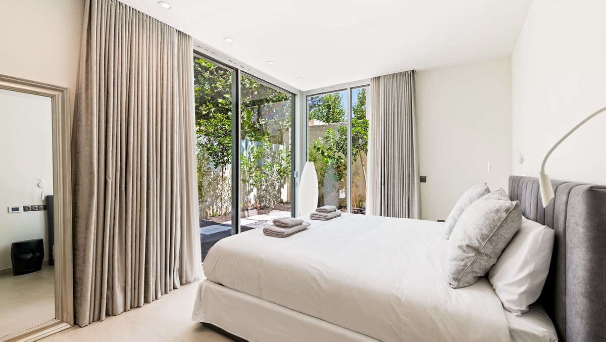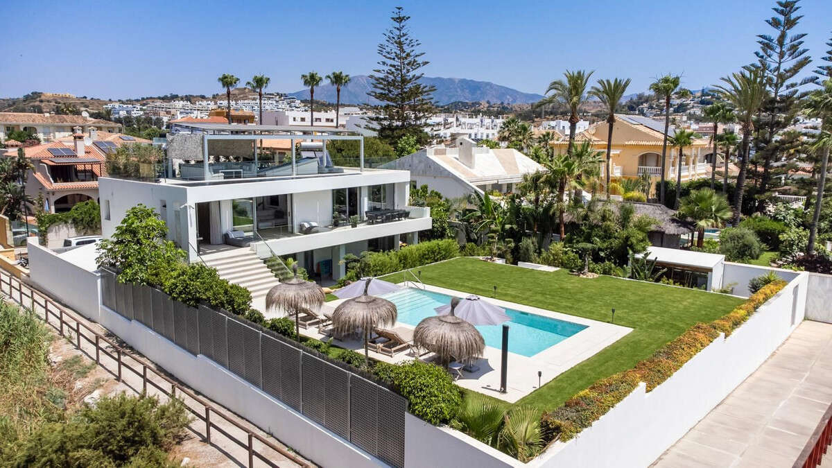 On the first floor, there are 4 spacious bedrooms, three of them with en-suite bathrooms and large windows overlooking the garden. On the main floor, there is a fifth bedroom with an en-suite bathroom and an outdoor bathtub with beautiful sea views, as well as a large living room with an open kitchen, island, and top-brand appliances. The beach and pool views can be enjoyed from the entire floor. Comfortable stairs lead to the solarium's chill-out area, with stunning views. The house is completed with a laundry area and various storage rooms on the ground floor, as well as an outdoor gym, toilets, and sauna in the garden.