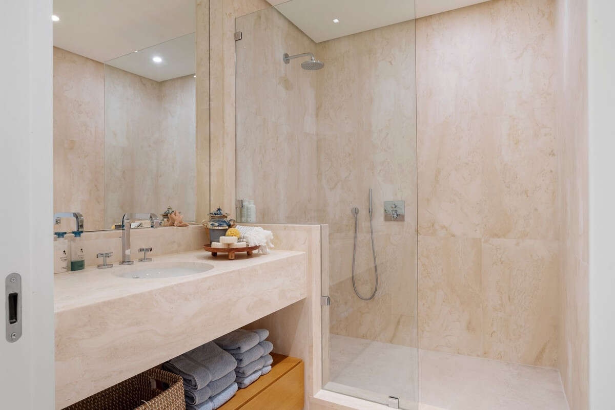 Ibiza-style villa located within the Finca Cortesin resort. Set on a large plot with landscaped gardens, the property offers panoramic views of the golf course and surrounding mountains. The villa is distributed over two levels and features a clean white façade with Mediterranean stone accents.