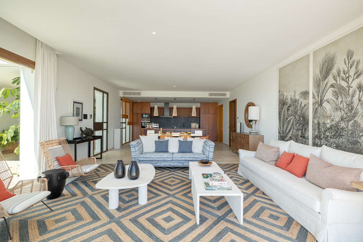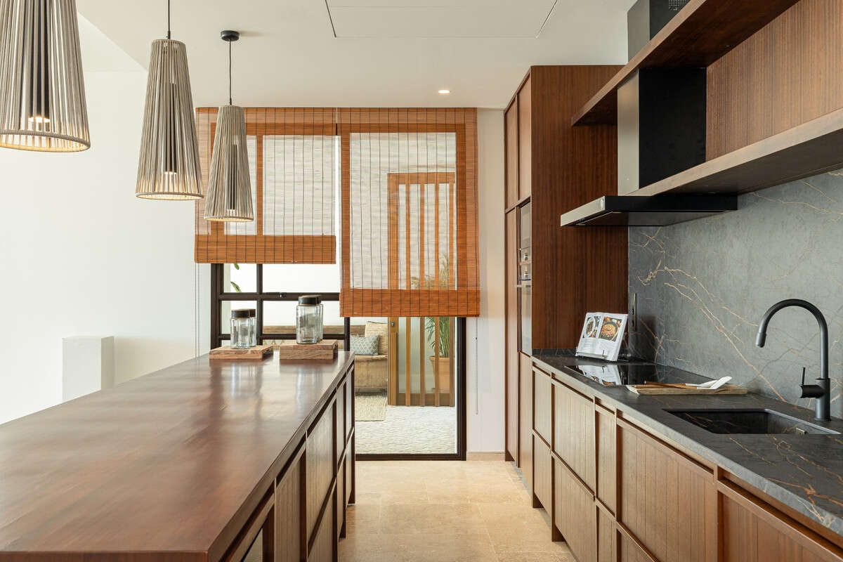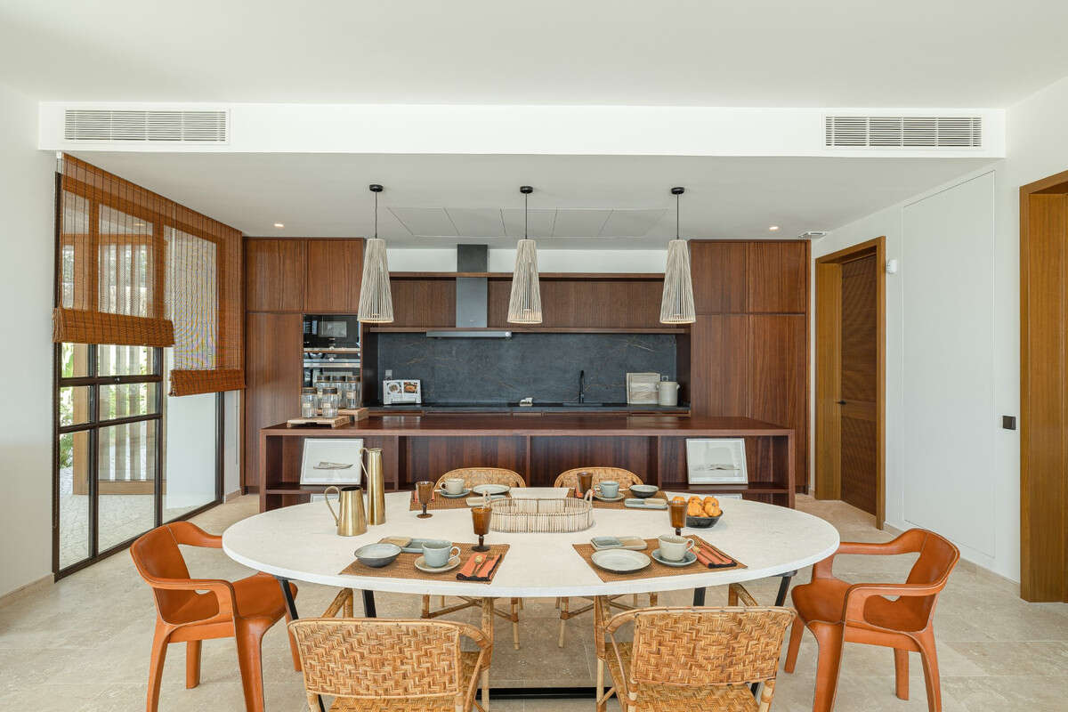 3 large bedrooms all with en-suite bathrooms. Each bedroom with large picture windows opening onto terrace. The bathrooms are equipped with a free standing bathtub and or a spacious shower, as well as having 2 washbasins each, offering total relaxation.