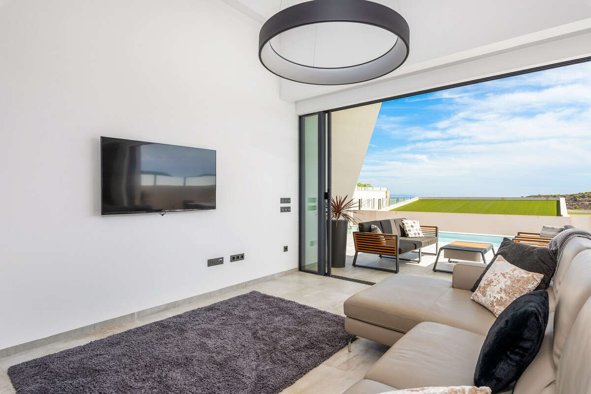 Outdoor areaThe villa is set on a lovely corner plot of 462 m2. The pool area is east facing, giving you amazing views over the surrounding area and to the sea. Around the pool you have a beautiful tiled area with space for several outdoor seating areas and sun beds. From the pool area you have external stairs leading you to the large roof terrace. Here you have one part that is tiled and the other part with artificial grass, both of them with a lot of space for outdoor entertainment and with amazing views. At the entrance to the house you have another lovely tiled garden area that faces west. This area is perfect to enjoy the afternoon / evening sun. At the lower level you can find a large tiled patio with an artificial vertical garden. This patio can be access from the garden through external stairs, and also from the living room and 2 of the bedrooms in the lower level.