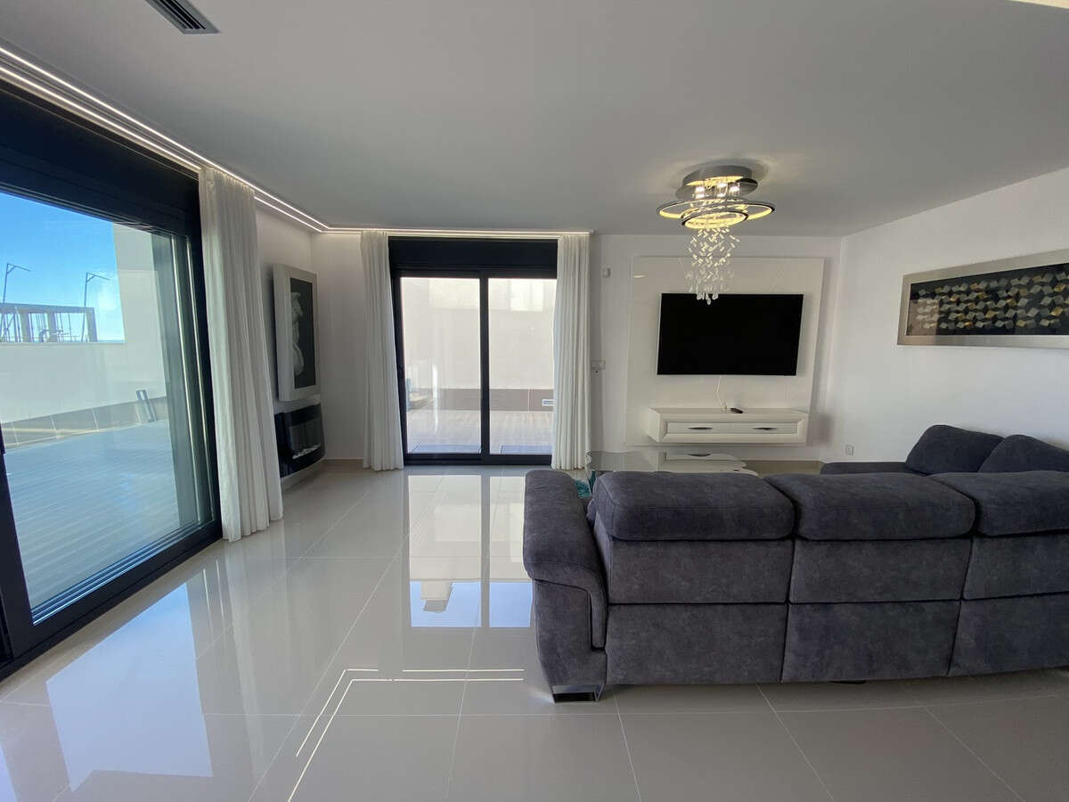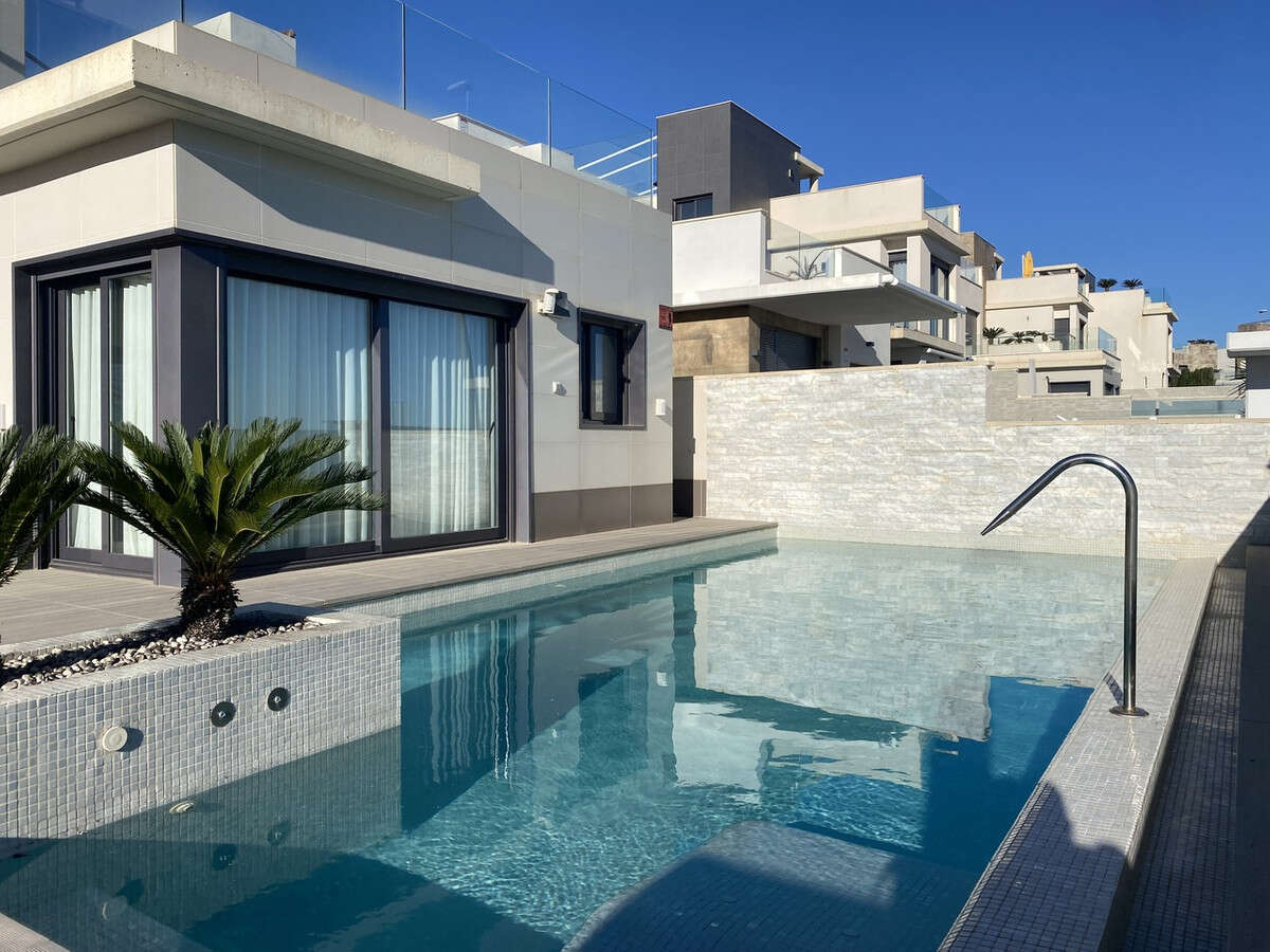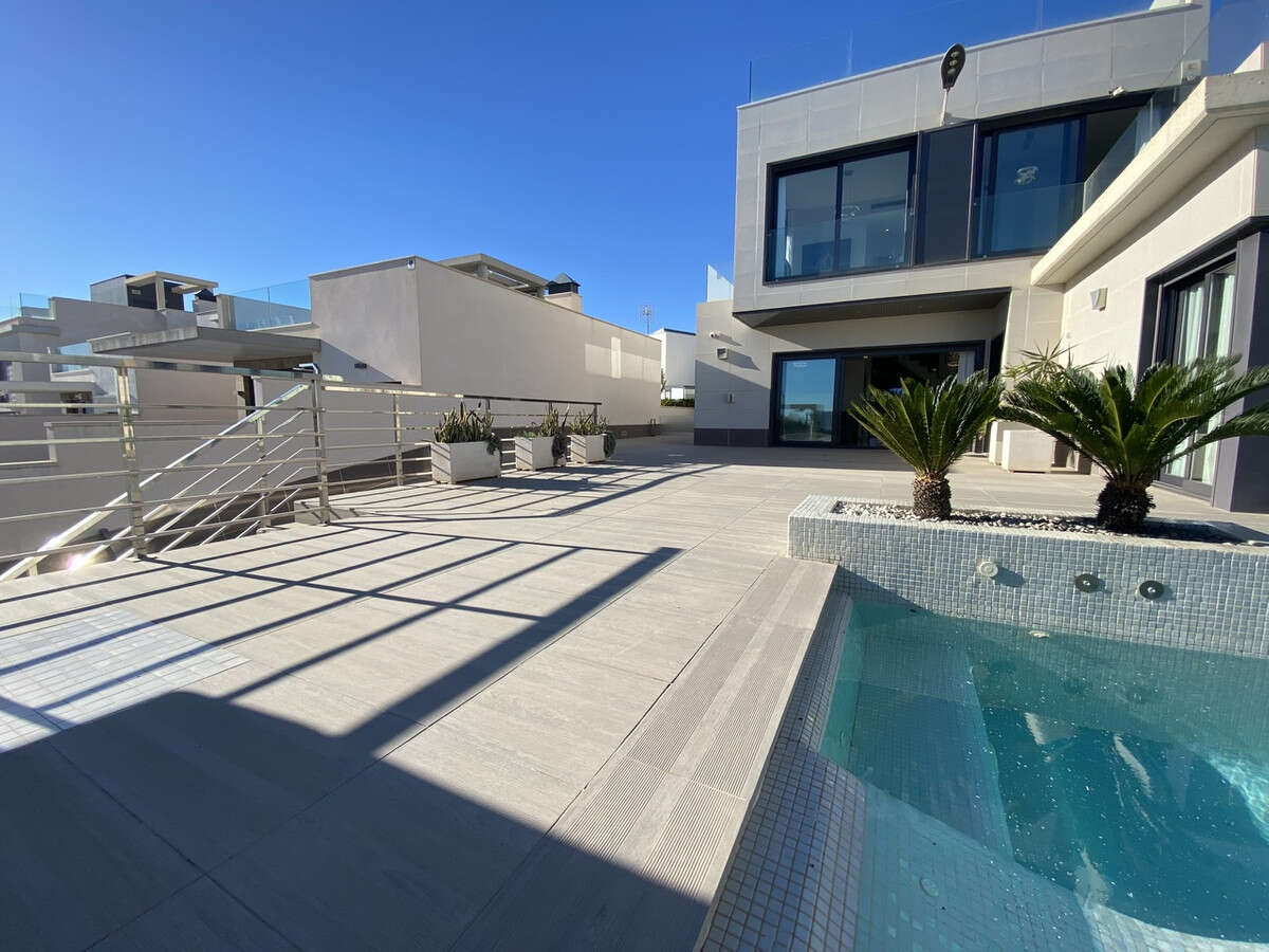 Welcome to this exceptional recently-built luxury villa at Residencial Bellavista, San Miguel de Salinas, offering a harmonious blend of contemporary design and breathtaking views. With a total of 5 bedrooms and 4 bathrooms, this meticulously crafted property spans two floors and a basement, accessible via a convenient elevator and a stunning glass staircase with interior lighting.