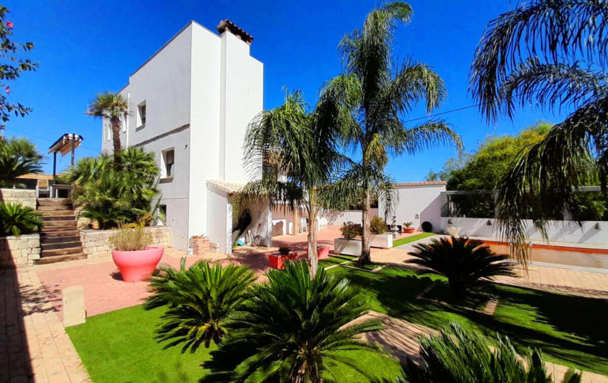 The villa also has a closed garage and a beautiful garden with palm trees.
